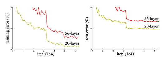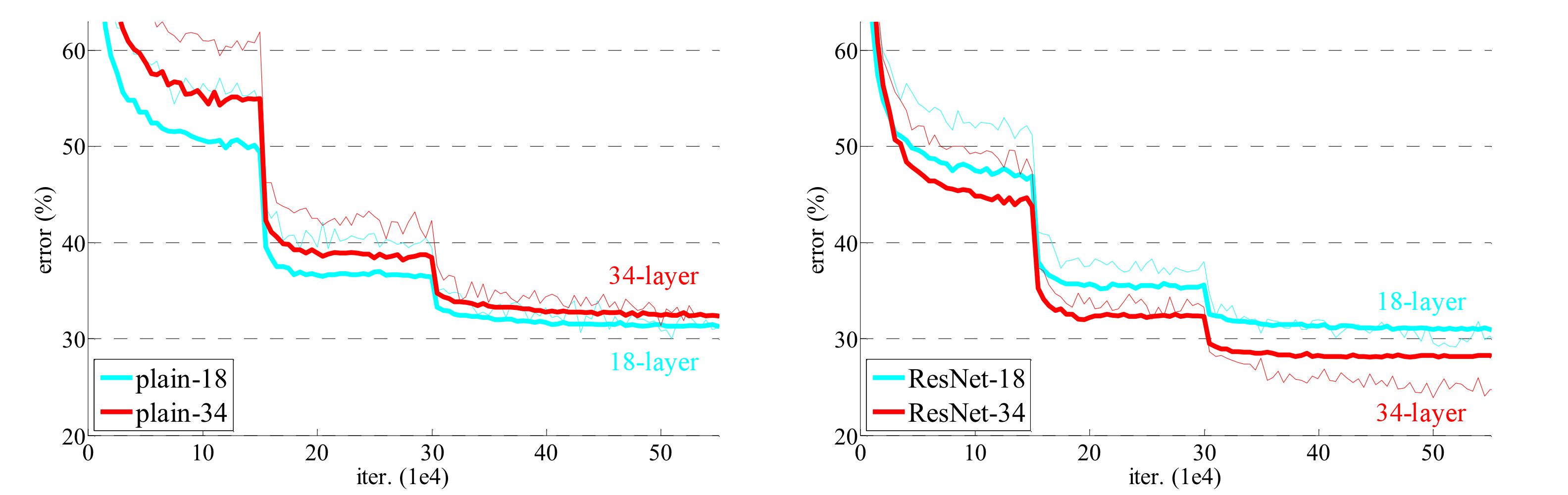 Plain Network를 사용하여 18개의 Layer로 구성된 모델과 34개의 Layer로 구성된 모델을 비교한 결과, 34개의 Layer를 가진 모델은 18개의 Layer를 가진 모델보다 학습 에러와 검증 에러가 모두 높아지는 성능 저하 문제(Degradation Problem)를 보였다. 논문에서는 이러한 문제가 기울기 소실이 아닌 수렴 속도가 지수적으로 감소했기 때문이라고 추정하였다. 즉, 깊은 네트워크의 최적화가 어려워 학습 성능이 좋지 못한 것이다.
