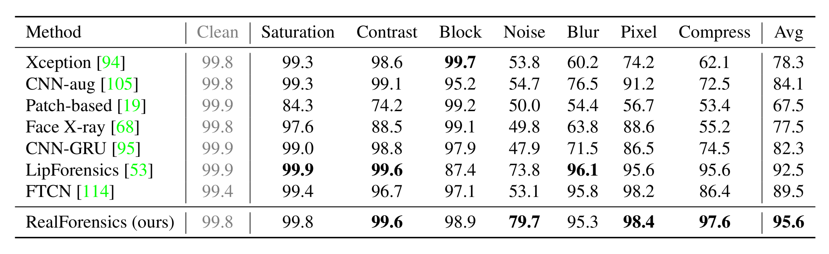 탐지기는 소셜 미디어에서 비디오가 겪는 흔한 변형에 대해서도 견고해야 한다. Table 4는 각 변형에 대한 모든 강도의 평균 AUC를 나타낸다. RealForensics는 저수준 단서에 집중하는 frame-based 방법보다 흔한 변형에 덜 취약하였다.