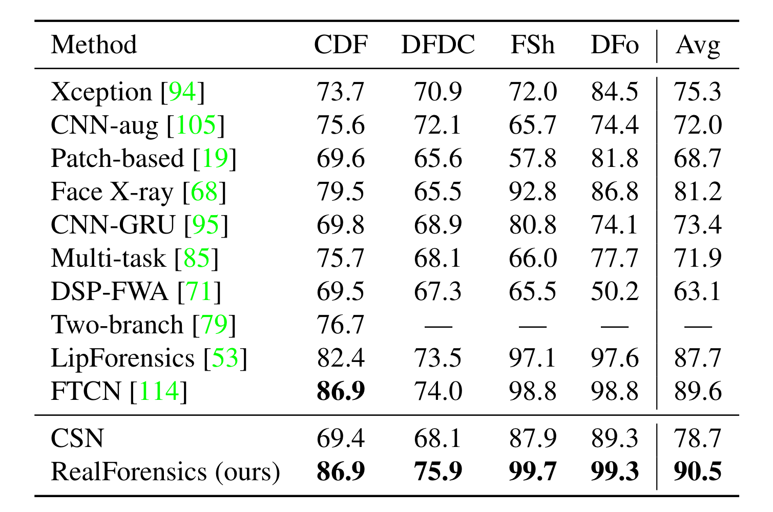 배포된 탐지기는 훈련 중에 보지 못한 방법으로 만들어진 위조 영상을 인식할 수 있어야 하며, 이는 쉽지 않은 작업이다. Table 1은 FF++ 데이터셋에 대해 특정 유형을 제외한 나머지 유형을 훈련한 후에 특정 유형에 대한 성능을 나타낸 결과이다. RealForensics는 auxiliary labelled supervision을 사용하지 않았고, 네트워크의 많은 부분을 고정하여 제한하거나 spatial convolution을 제거하지 않았고, 테스트 시 오디오를 사용하지 않았음에도 SOTA 성능을 달성하였다. 또한, 동일한 증강 방식을 사용한 위조 데이터에 대해 학습한 CSN 네트워크보다 성능이 뛰어나 실제 데이터 활용하는 접근 방식의 효과를 입증하였다.