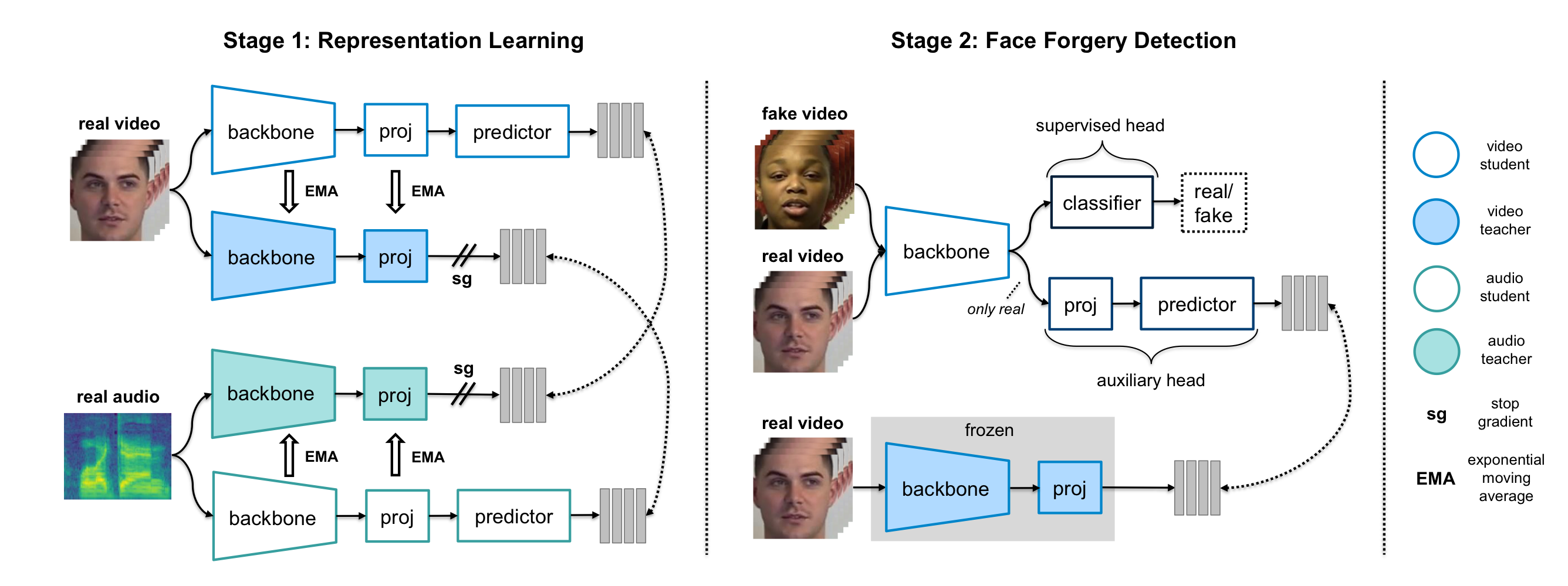 Stage 2 : BYOL에서 영감을 받아, cross-modal student-teacher framework 사용 (위조 탐지와 예측을 동시에 수행)