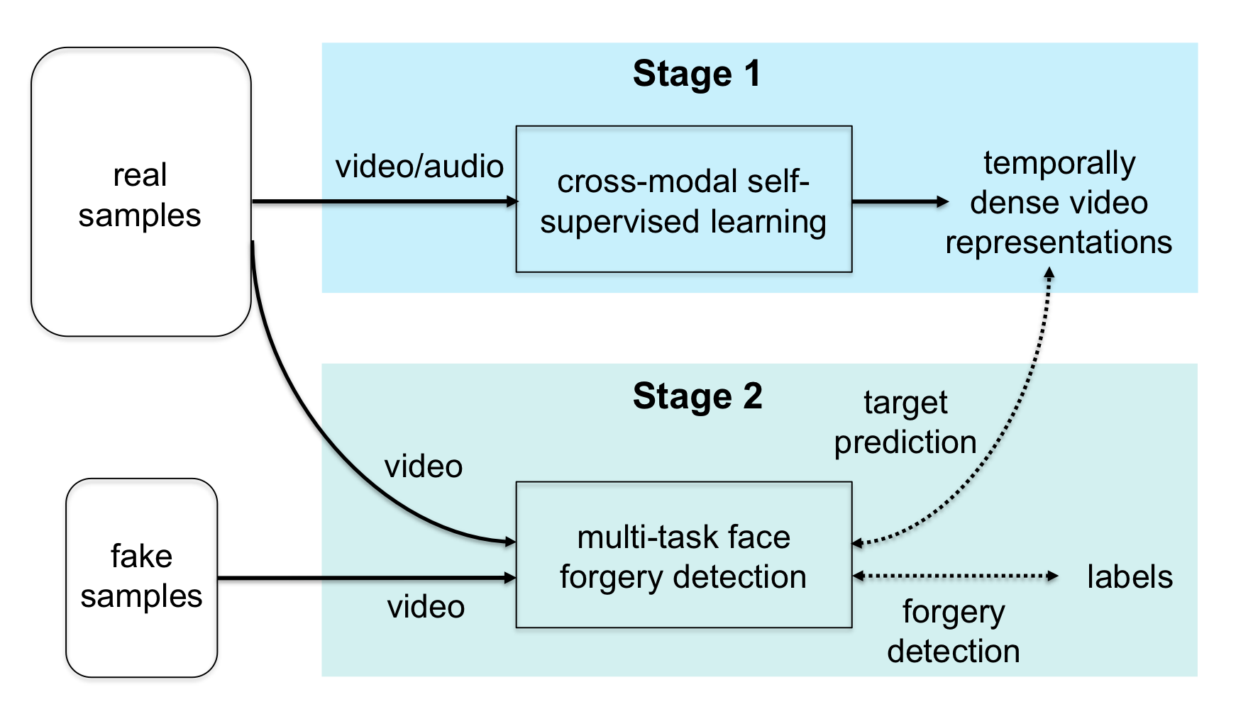 이 단계는 비주얼 기반 위조 탐지기를 학습하는 것을 목표로 하므로 1단계에서 학습된 오디오 학생-교사 네트워크를 사용하지 않는다. 1단계에서 학습된 비디오 교사가 네트워크가 예측해야 하는 타겟을 생성하고, 동시에 네트워크는 위조 탐지를 수행한다. (교사 네트워크는 고정됨) 보조 손실 (auxiliary loss)를 사용해 네트워크가 얼굴 외형과 행동의 고수준 시공간적 특징에 집중함으로써 진짜와 가짜 영상을 구분하도록 유도할 수 있다.