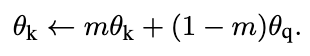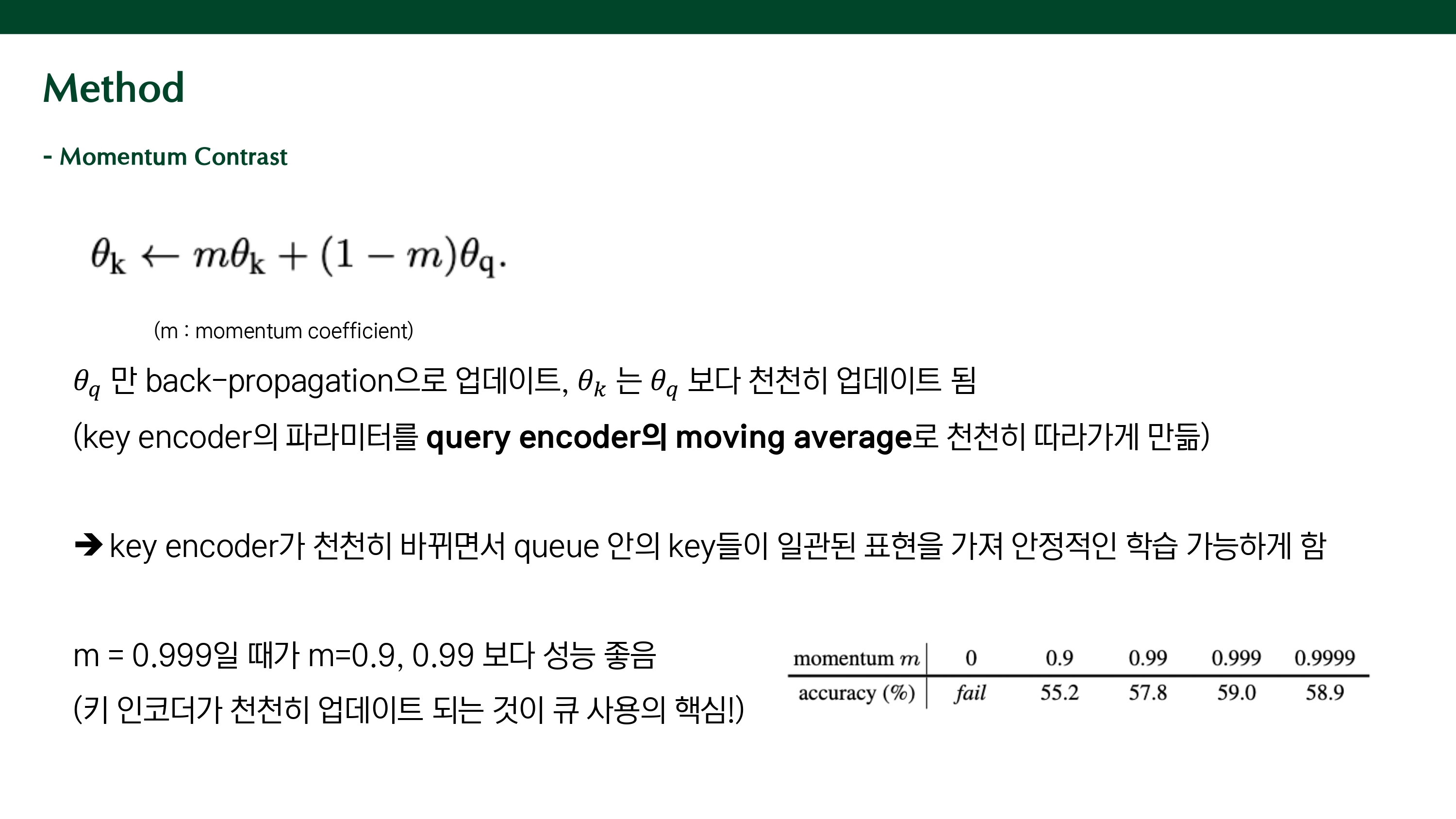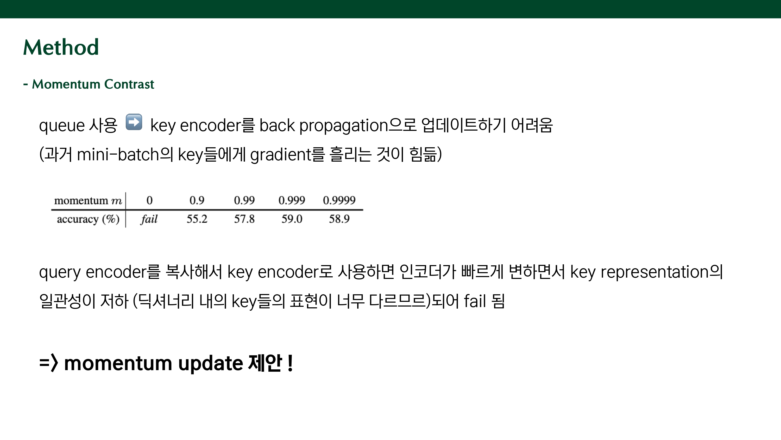 그런데, 큐를 사용함으로써 key encoder를 back propagation으로 업데이트하기 어려워진다. 나이브한 솔루션으로 query encoder를 복사해서 key encoder로 사용하면 인코더가 빠르게 변하면서 key representation의 일관성이 크게 저하되어 accuracy가 진동하다가 수렴하지 못하는 현상이 발생한다. (위의 표에서 m=0인 케이스)