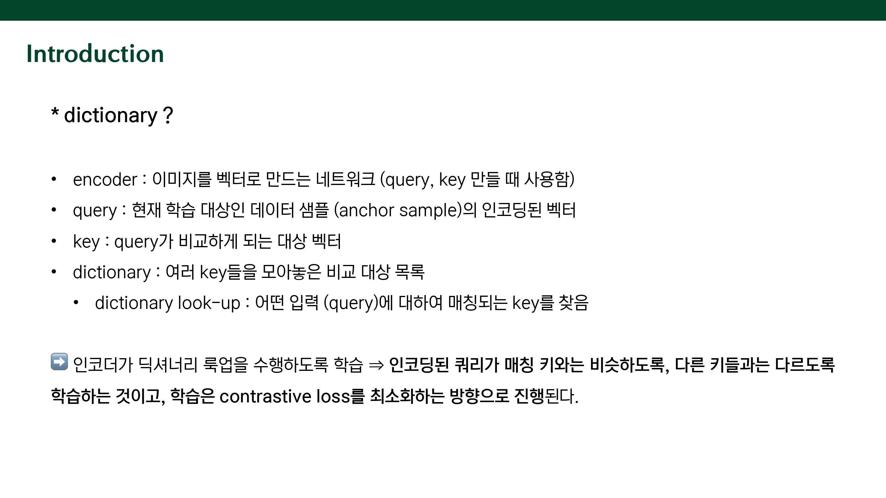 ➡️ 인코더가 딕셔너리 룩업을 수행하도록 학습되어진다. 이는 인코딩된 쿼리가 매칭 키와는 비슷하도록, 다른 키들과는 다르도록 학습하는 것이고, 학습은 contrastive loss를 최소화하는 방향으로 진행된다.