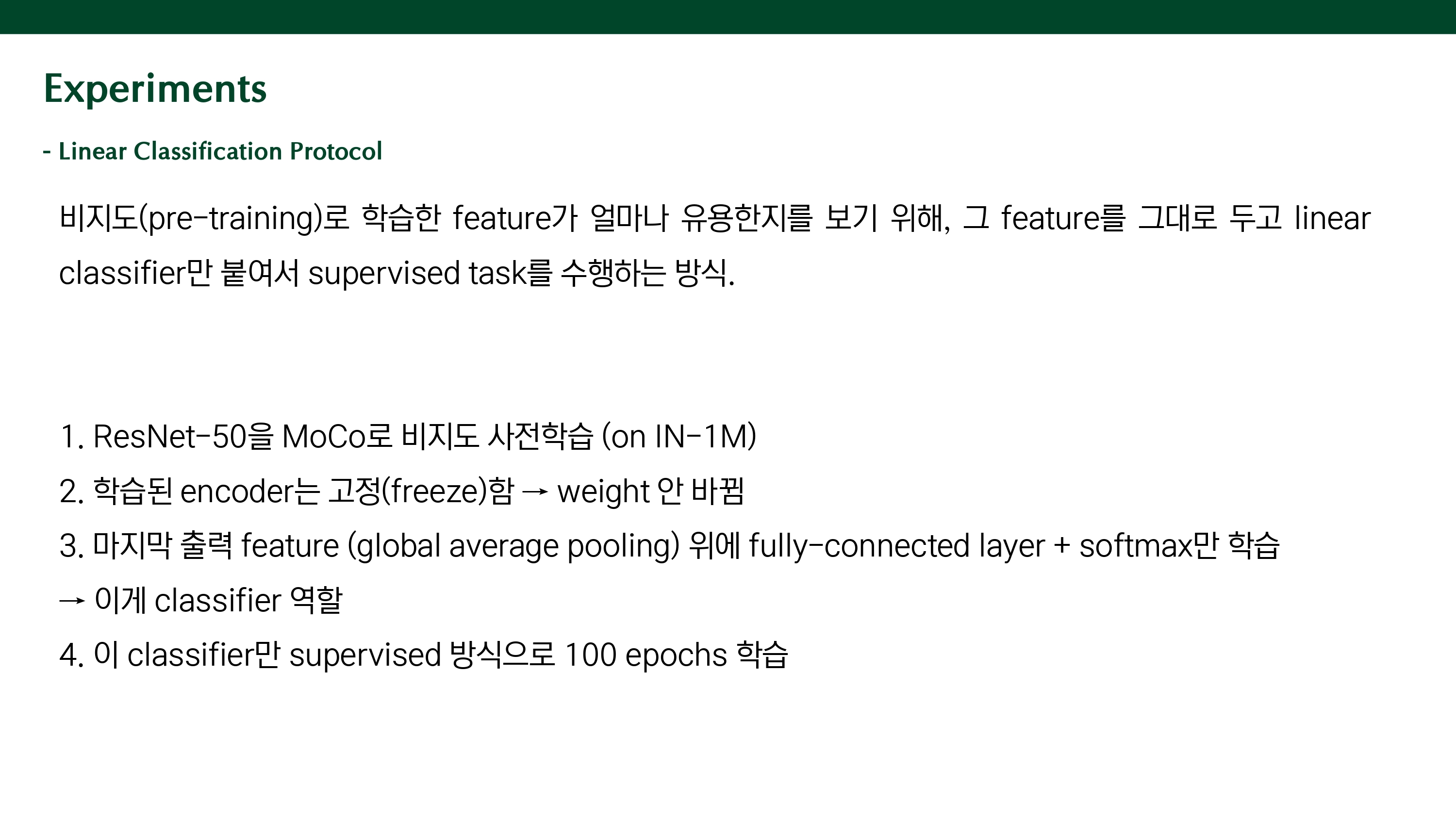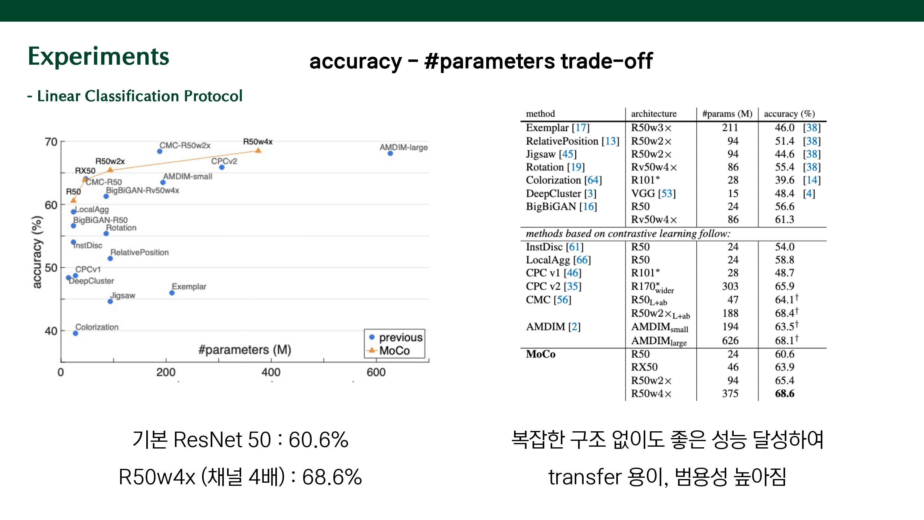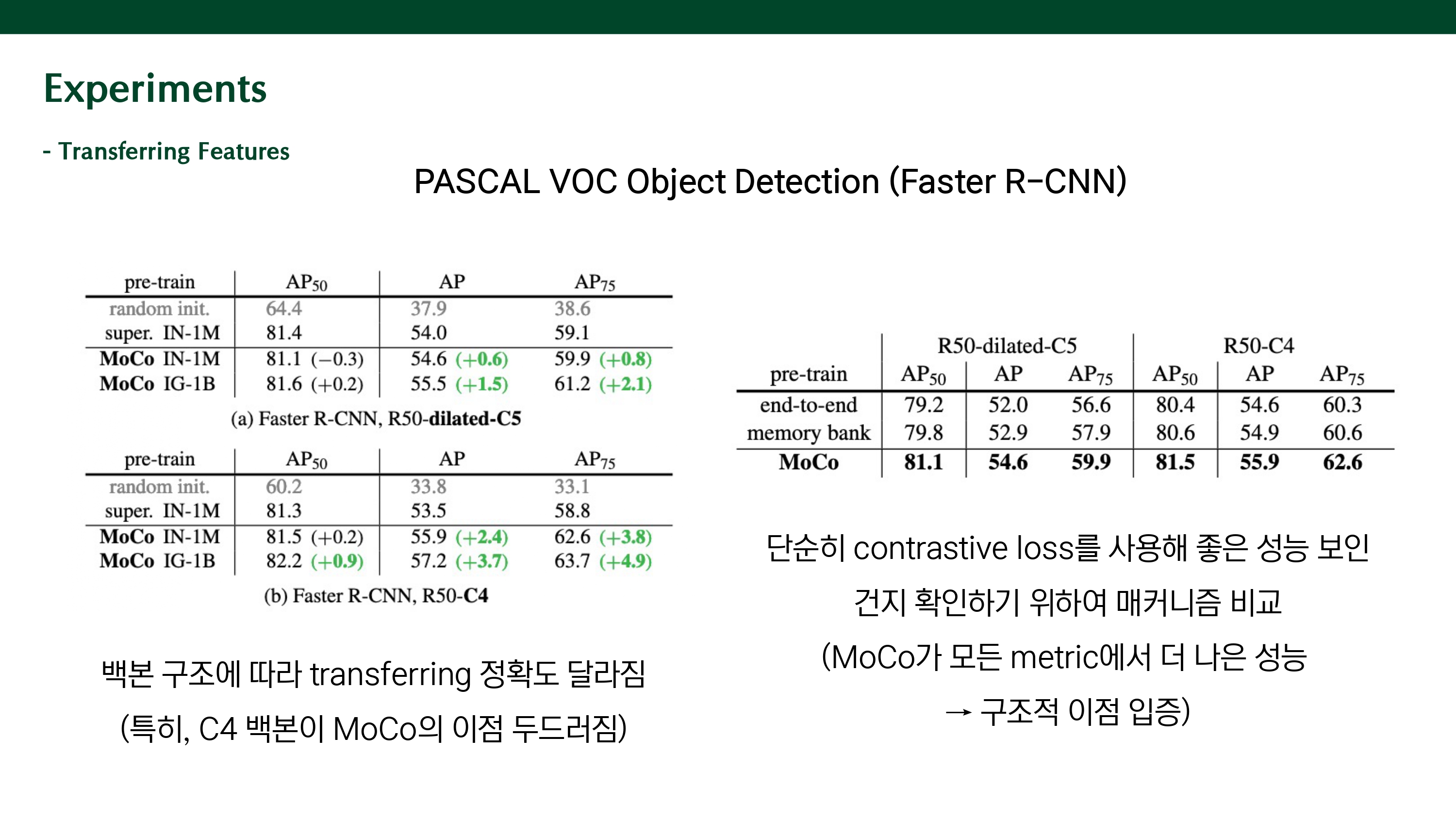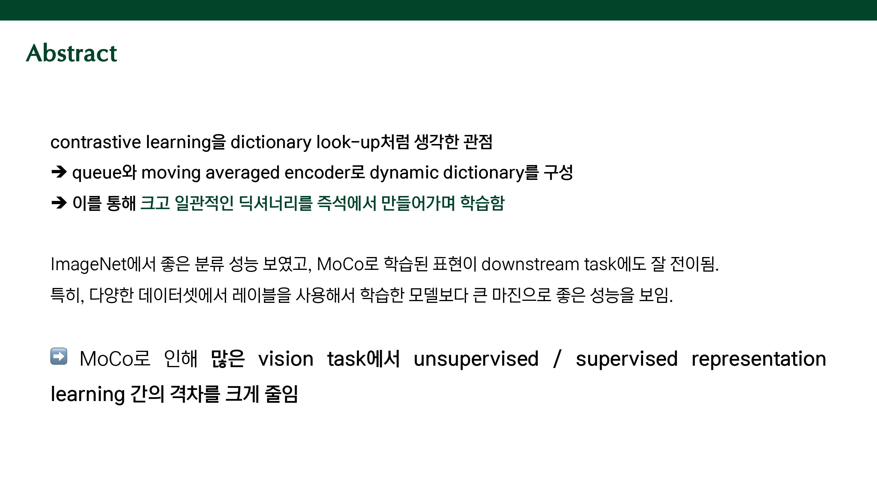 ➡️ 즉, MoCo로 인해 많은 vision task에서 비지도 표현 학습과 지도 표현 학습 간의 격차가 크게 줄었다고 할 수 있음.