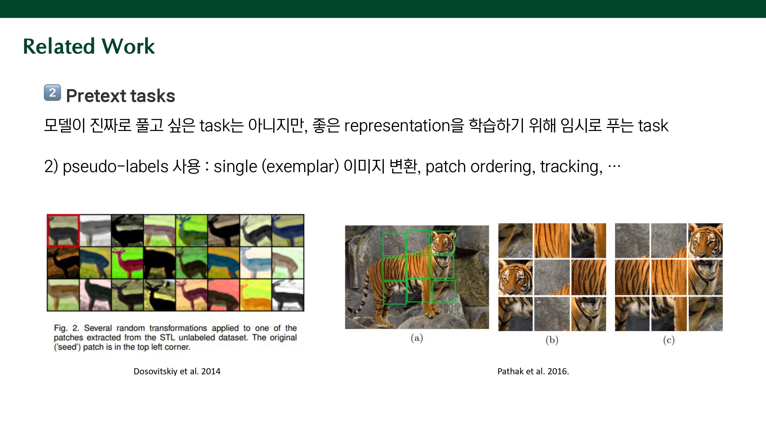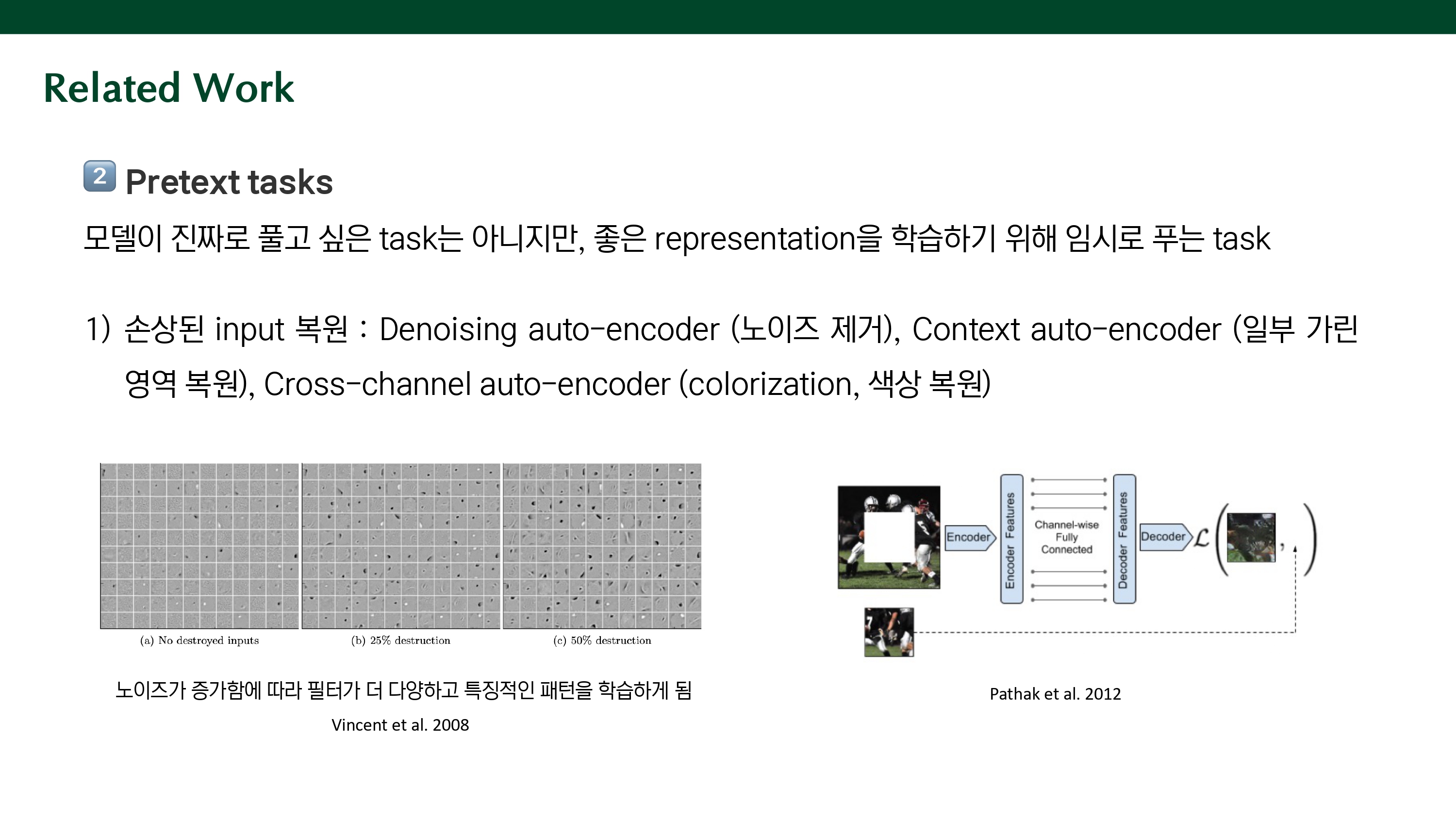 pretext task (선행 과제)는 모델이 진짜로 풀고 싶은 과제는 아니지만, 좋은 표현을 학습하기 위해 임시로 푸는 과제이다. 그 범위가 매우 넓은데 input을 복원하는 것, pseudo-label을 만들어서 학습하는 것 등이 있다.