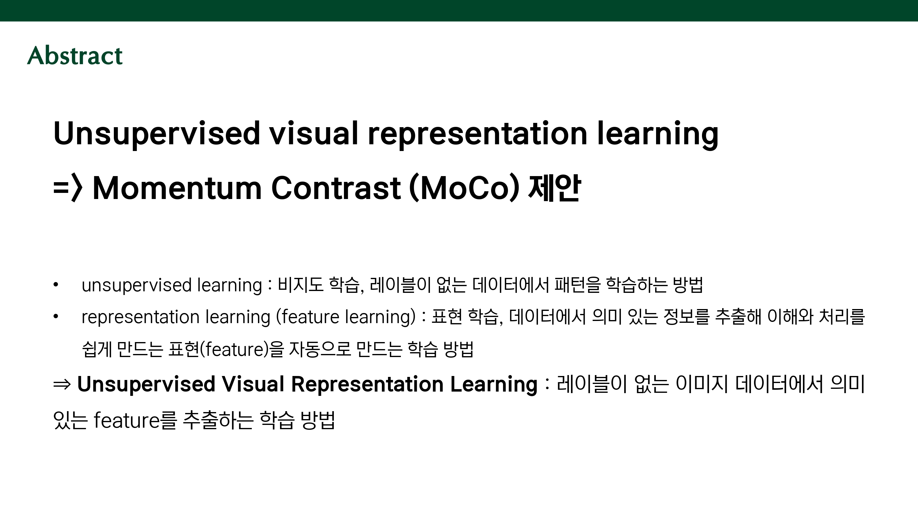 ⇒ Unsupervised Visual Representation Learning : 레이블이 없는 이미지 데이터에서 의미 있는 feature를 추출하는 학습 방법
