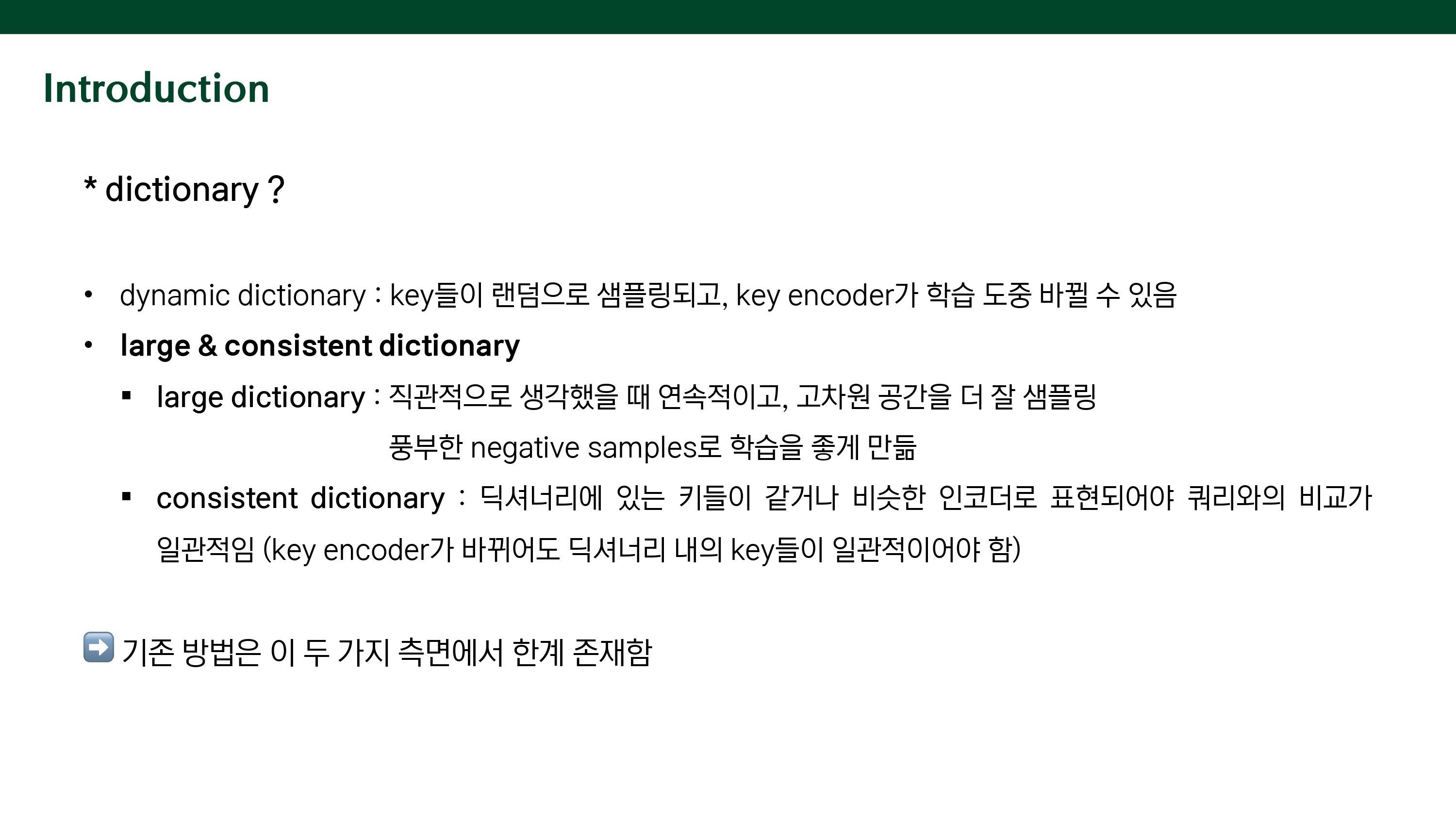 dynamic dictionary란, key들이 랜덤으로 샘플링되고, key encoder가 학습 도중에 업데이트될 수 있음을 의미한다. 또, 논문 내내 large and consistent dictionary를 구축해야 한다고 강조한다. 딕셔너리 사이즈가 클수록 풍부한 negative samples로 인해 연속적이고, 고차원 공간을 더 잘 샘플링할 수 있다. 또한, 딕셔너리에 있는 키들이 같거나 비슷한 encoder로 표현되어야 쿼리와 키의 비교가 일관적이다. 즉, key encoder가 업데이트되어도 딕셔너리 내의 key들의 표현이 일관적이어야 한다.