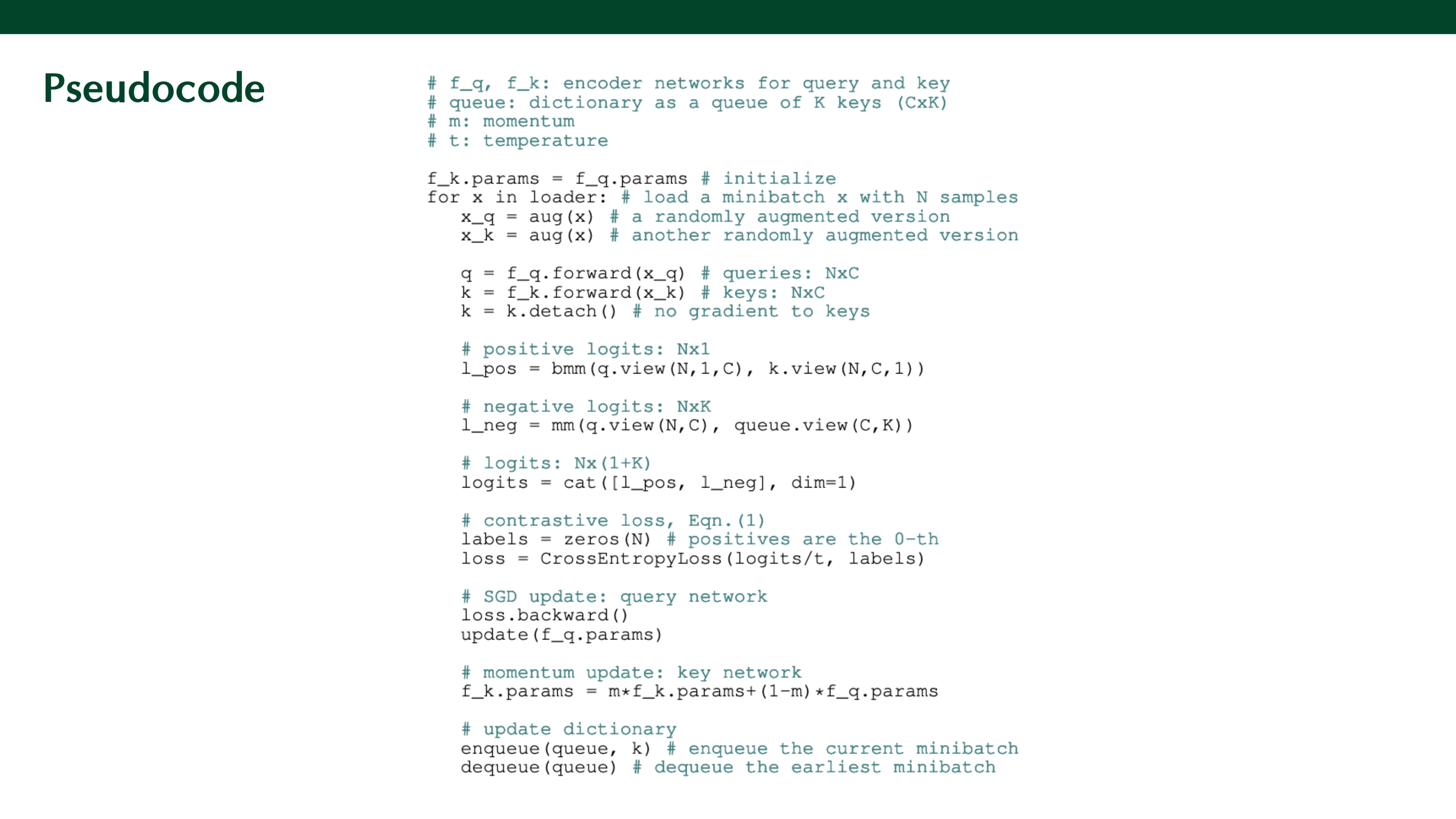 키 인코더와 쿼리 인코더의 파라미터를 동일하게 초기화하고, n개의 샘플이 있는 미니배치에서 두 번의 랜덤 augmentation으로 positive pair를 구성한다. 각 샘플을 쿼리 인코더와 키 인코더의 넣어 인코딩하고 key에는 gradient를 안흘릴 것이므로 detach() 한다. q와 k의 유사도를 측정하여 positive logit을 만들고, positive key는 1개이므로 nx1이 된다. q와 큐 내의 k와의 유사도를 측정하여 negative logits을 계산한다. 키가 총 k개 있으므로 nxk가 된다. positive logit과 negative logit을 concat하고, 0번째가 positive logit이므로 이를 정답 레이블로 활용하여 cross-entropy loss를 계산한다. back propagation으로 쿼리 인코더를 업데이트하고, 키 인코더는 momentum update를 한다.