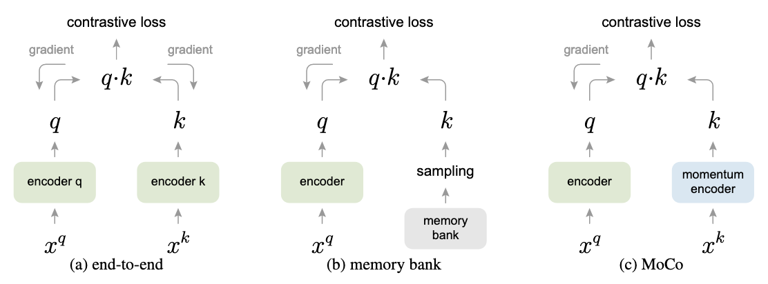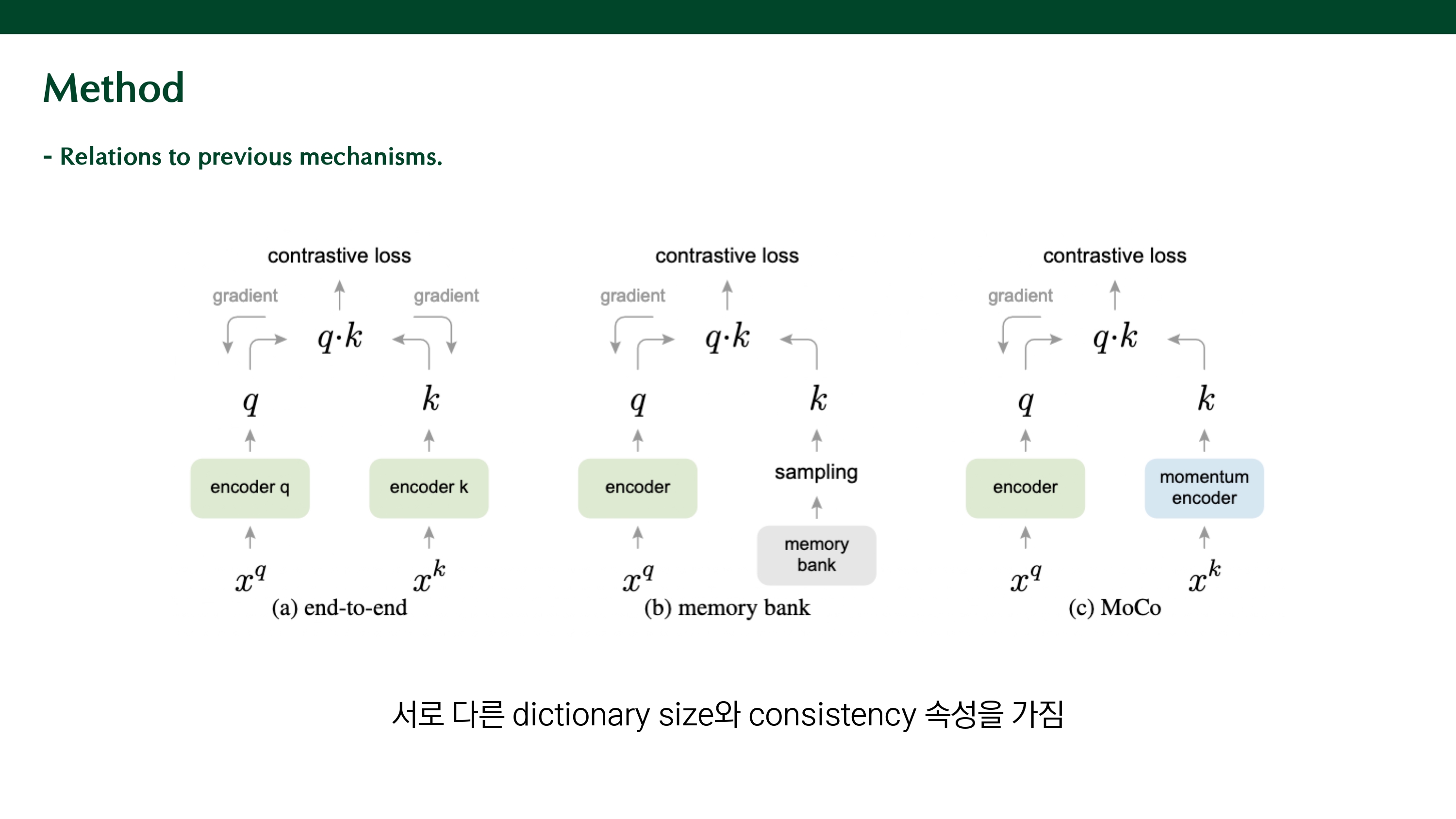 이 세 매커니즘은 모두 contrastive loss를 사용하지만, 서로 다른 dictionary size와 consistency 속성을 가진다.