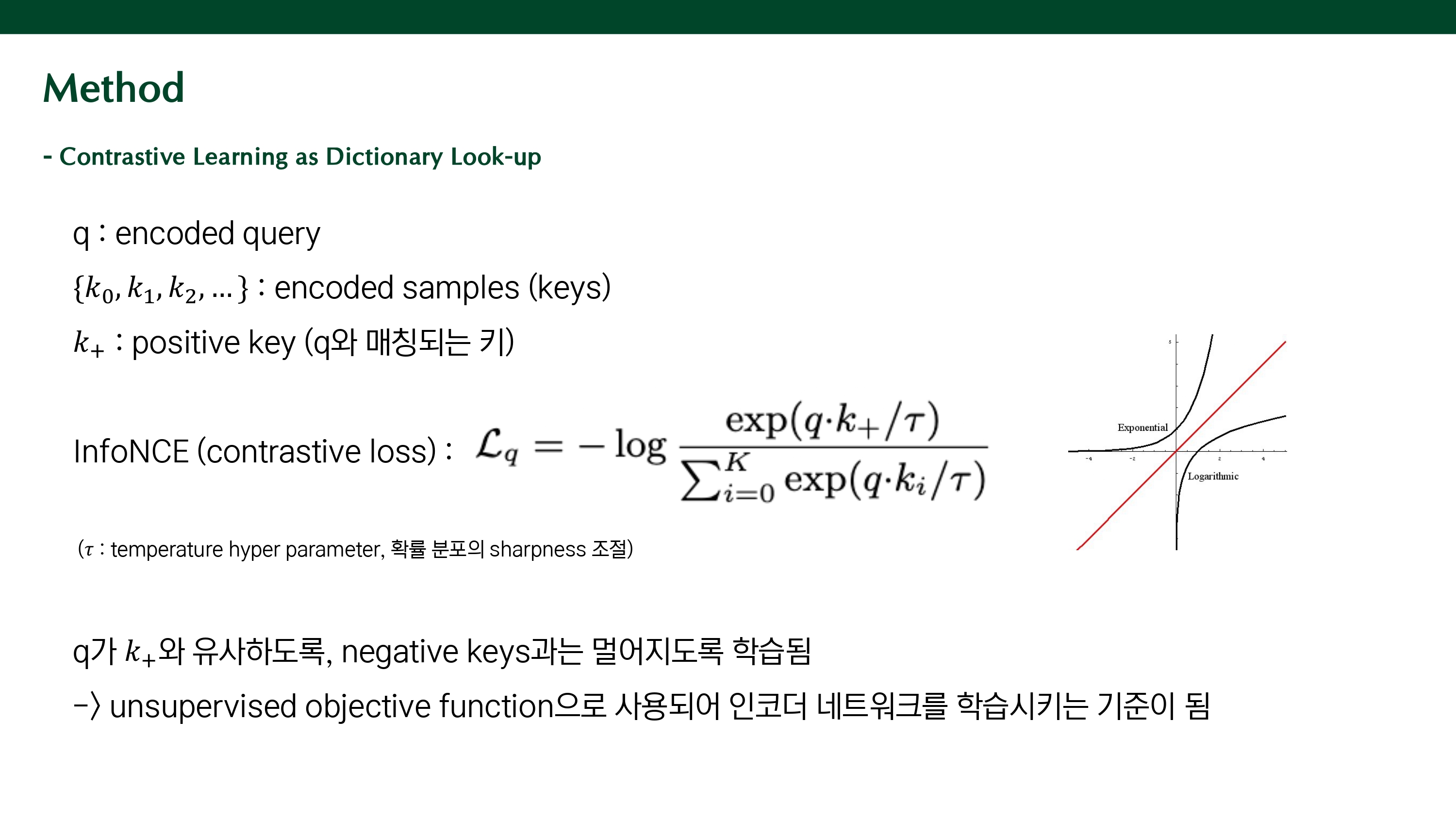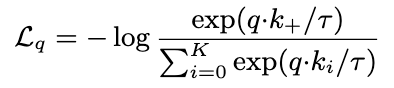 contrastive learning은 딕셔너리 룩업을 하도록 인코더를 학습한다고 할 수 있다. 인코딩된 쿼리를 q, 인코딩된 키들을 k0, k1, .. 이라고 할 때, q와 매칭되는 단일 키가 존재하고 이를 positive key인 k+라고 한다. q가 이 k+와 유사하고 negative keys과는 유사하지 않을 때 contrastive loss 값이 작아진다.