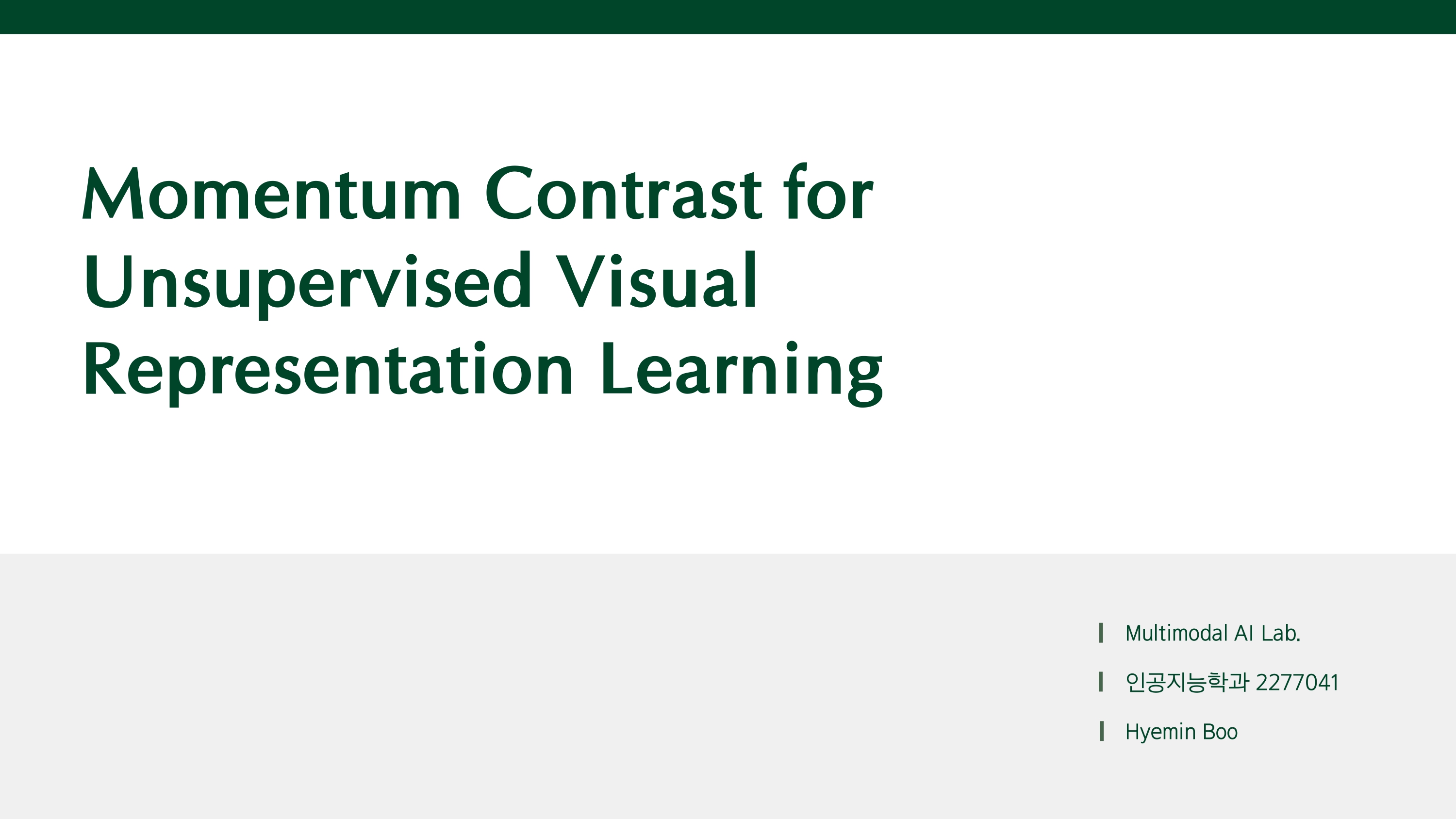 본 논문은 Unsupervised visual representation learning을 효과적으로 하기 위한 방법으로 Momentum Contrast (MoCo)를 제안하였다.