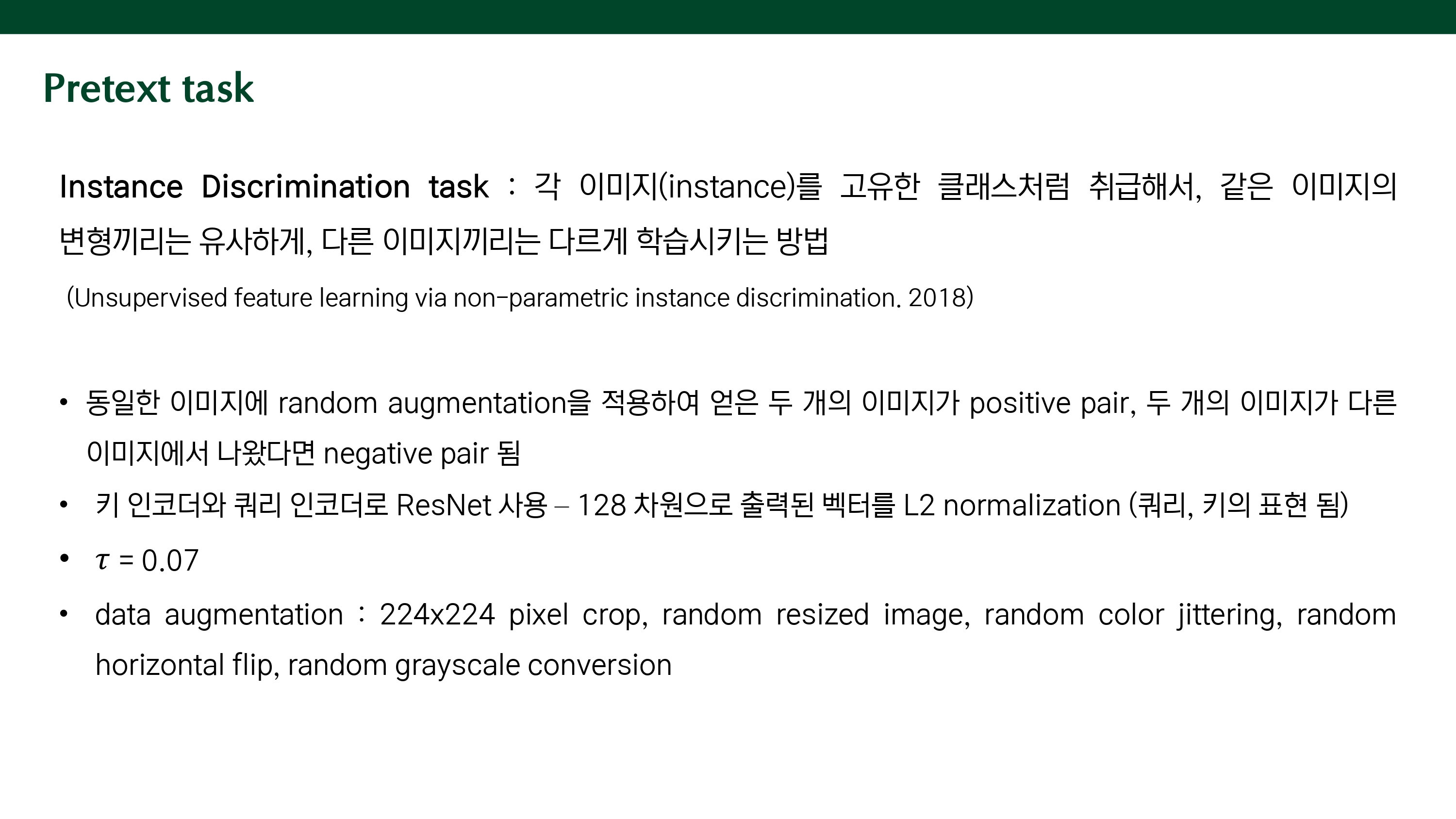 Unsupervised feature learning via non-parametric instance discrimination (2018)에서 제안되었던 task로, 각 이미지 (instance)를 고유한 클래스처럼 취급해서, 같은 이미지의 변형끼리는 유사하도록, 다른 이미지끼리는 달라지도록 학습하는 방법이다.