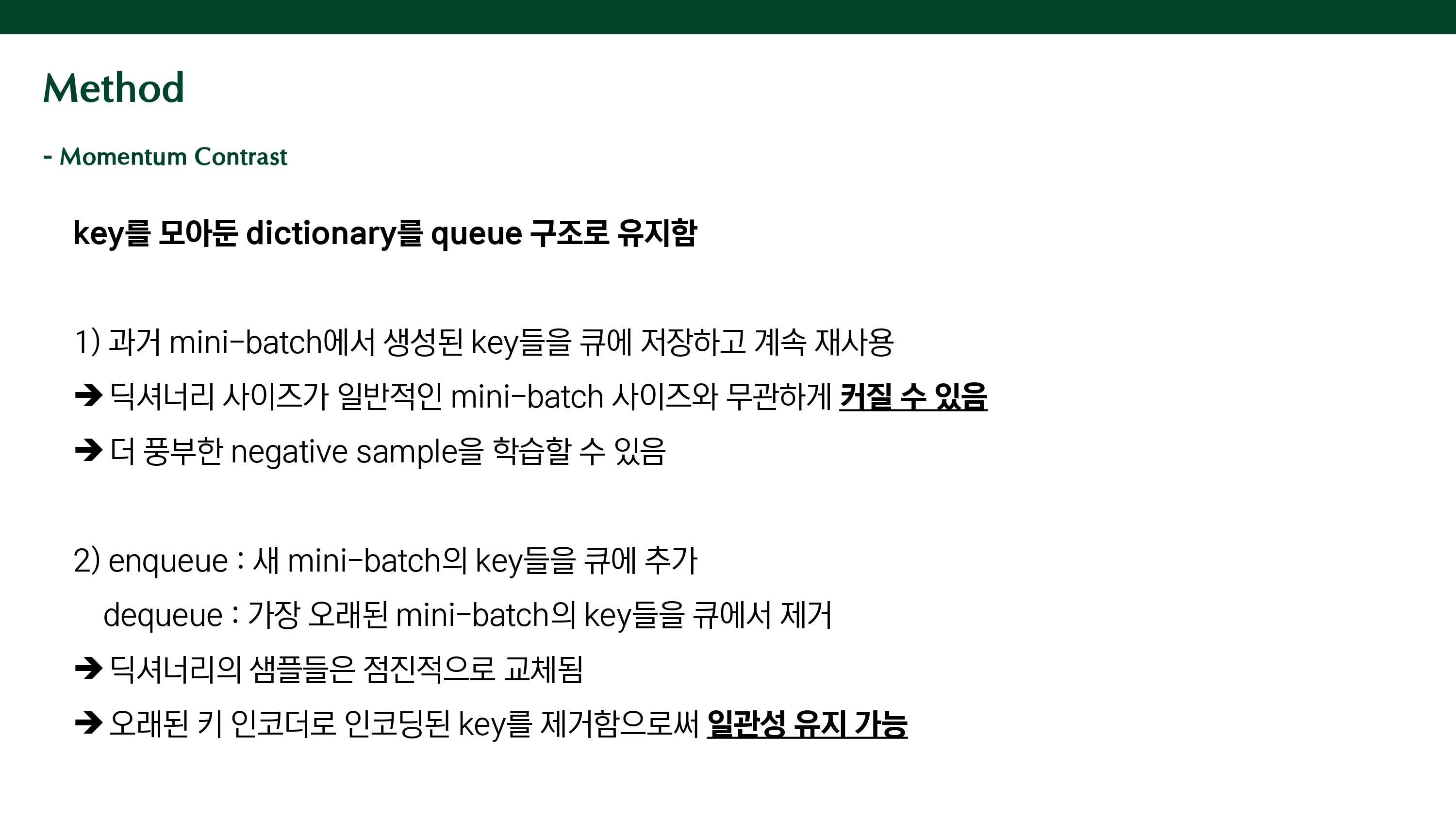 MoCo의 방법론의 핵심은 key를 모아둔 딕셔너리를 선입선출의 특성을 가지는 자료구조인 queue로 구현한 것이다. 큐를 사용함으로써 과거 mini-batch에서 생성된 키들을 큐에 저장하고 계속 재사용할 수 있다. 이를 통해, 딕셔너리 사이즈가 mini-batch 사이즈와 무관하게 커질 수 있고, 더 풍부한 negative sample을 학습할 수 있다. 또한, 새 mini-batch의 키들을 큐에 추가하는 enqueue, 가장 오래된 mini-batch의 키들을 큐에서 제거하는 dequeue를 통해 딕셔너리의 샘플들이 점진적으로 교체된다. 오래된 key encoder로 인코딩된 키를 제거함으로써 딕셔너리 내 키들 간의 일관성을 유지할 수 있다.