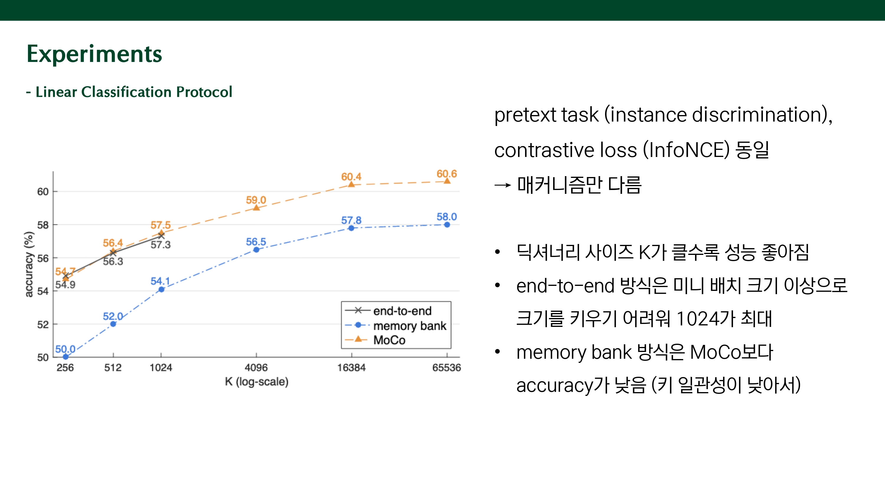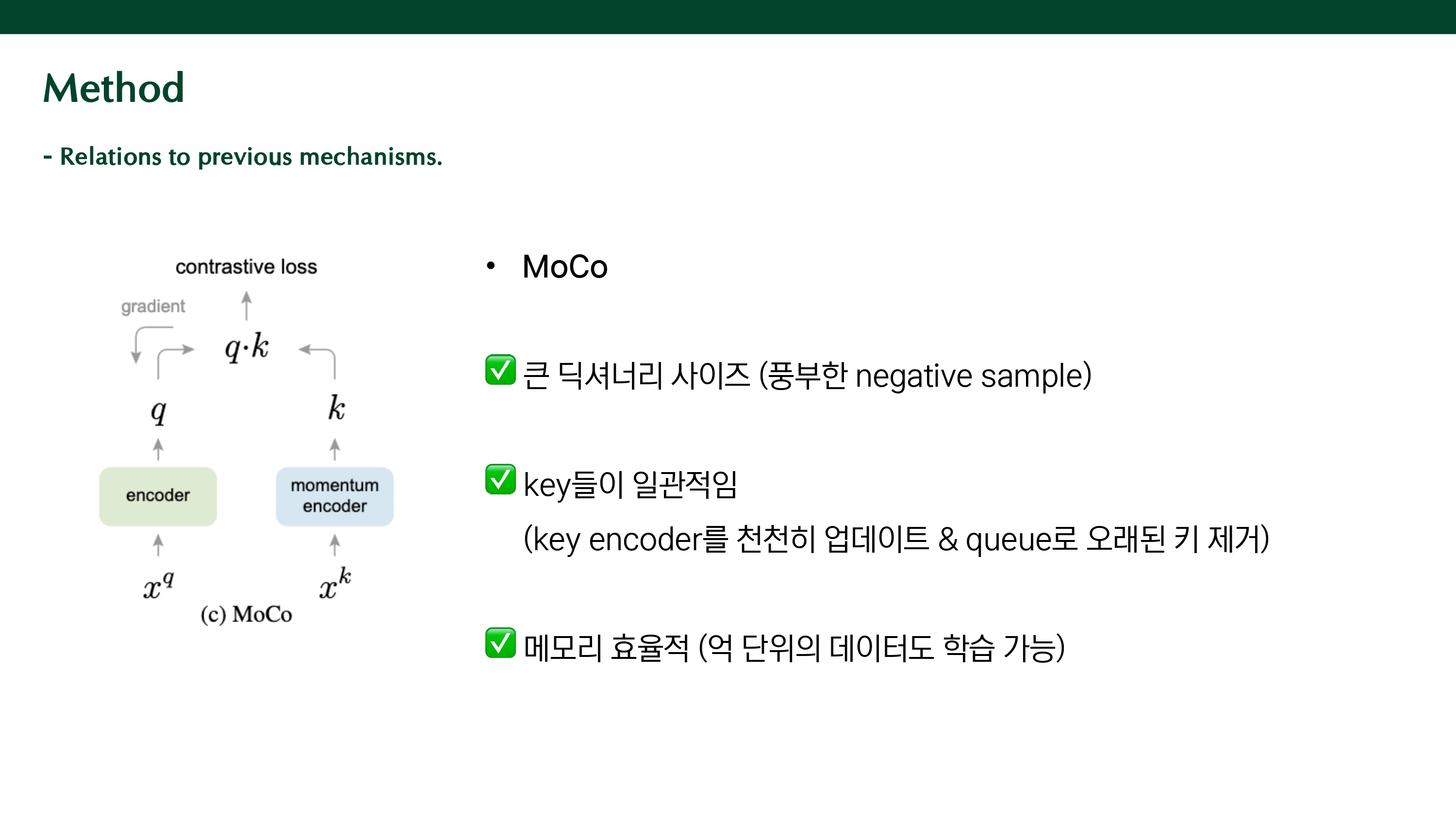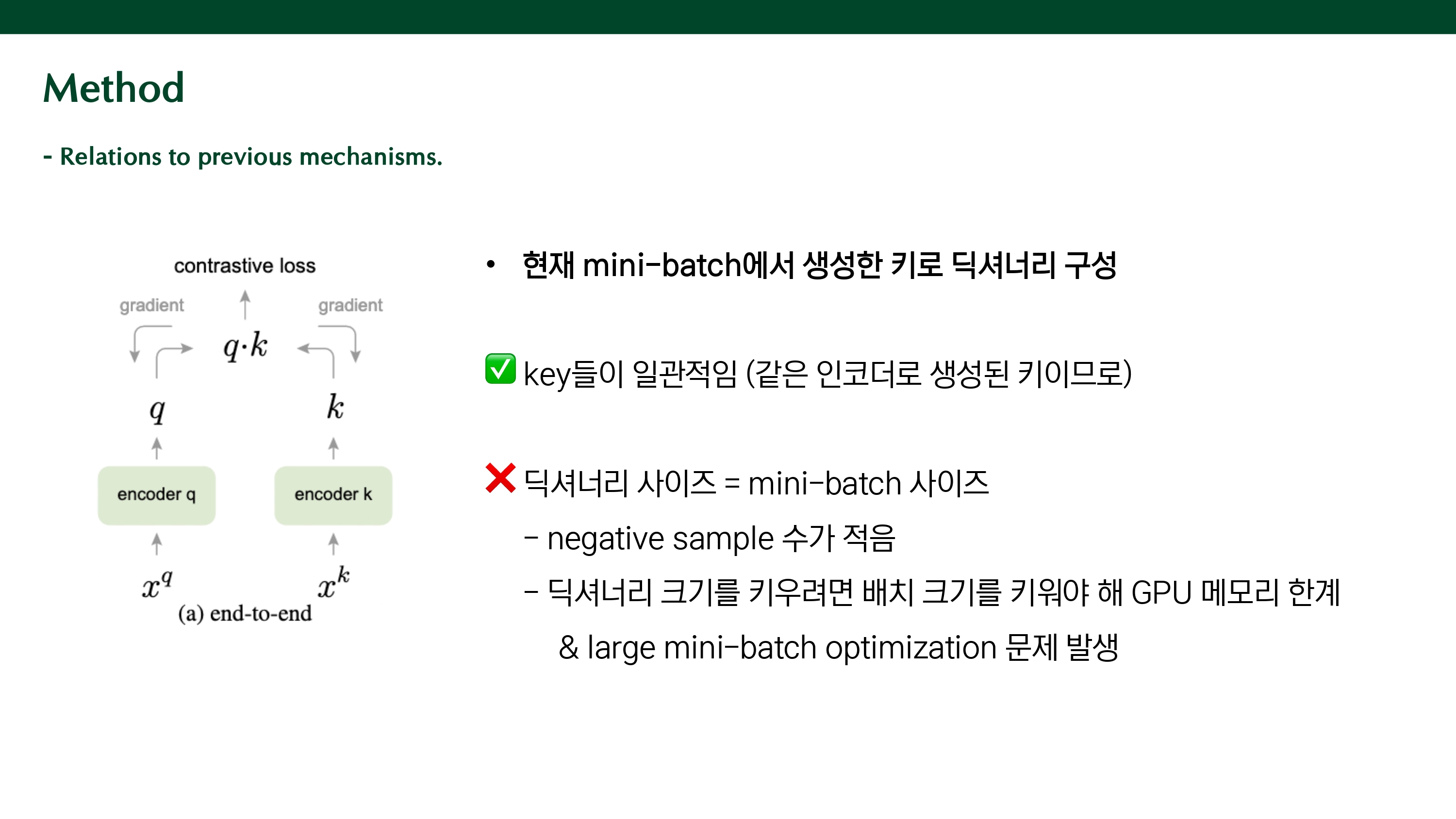 미니 배치 사이즈와 무관하게 딕셔너리를 구축할 수 있어 큰 딕셔너리 사이즈를 가질 수 있다. 하지만, memory bank에 오래 전에 인코딩된 키가 저장되어 있으므로 딕셔너리 내의 키들 간의 일관성이 크게 저하될 수 있다. 또한, memory bank에 모든 샘플의 representation을 저장해야 하므로 메모리 측면에서 비효율적이다.