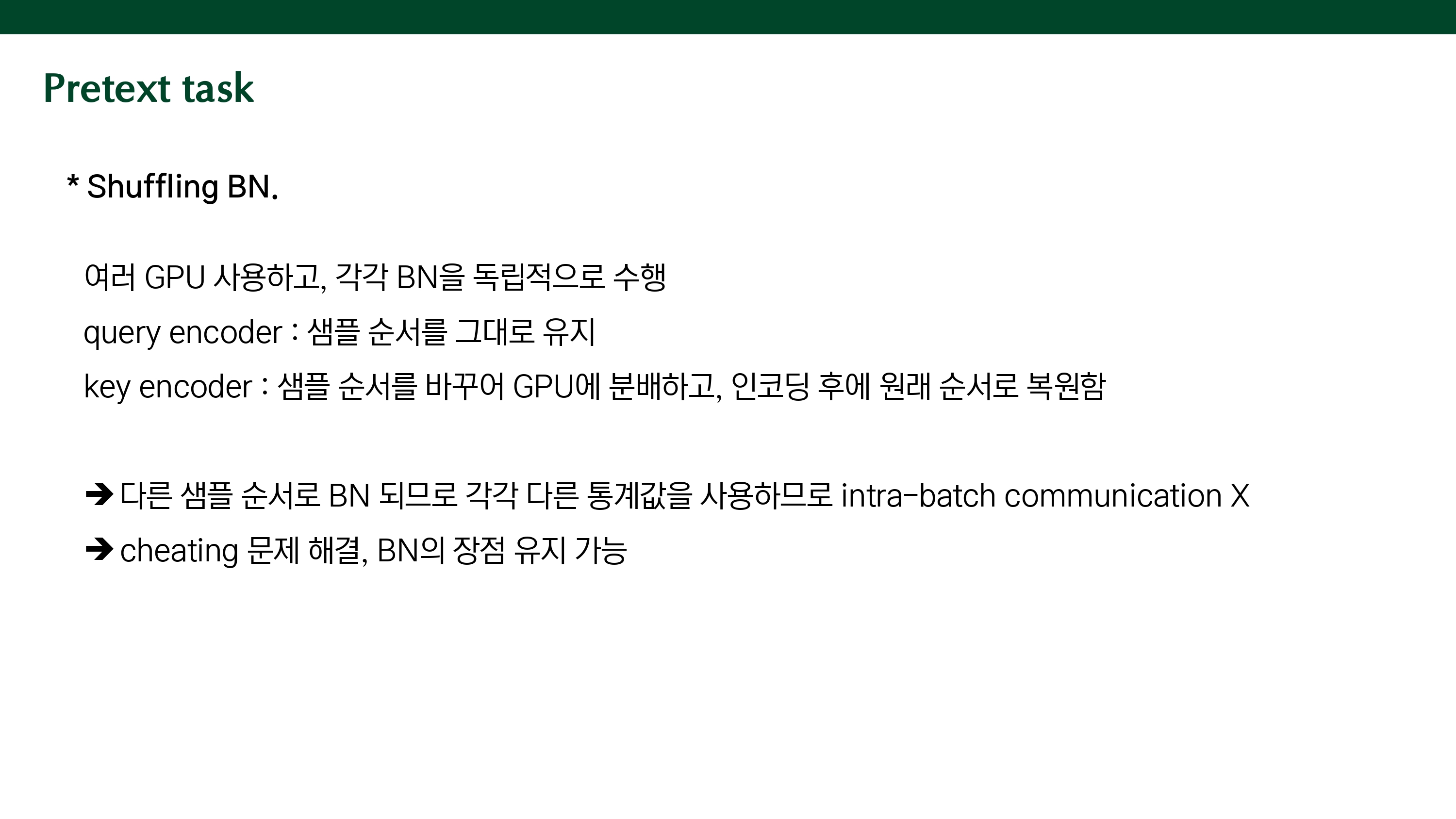 Batch Normalization을 하면 같은 배치 안의 모든 샘플이 동일한 평균과 분산으로 정규화된다. 그런데, contrastive learning은 같은 이미지에서 나온 쿼리와 키가 positive pair가 되고, 이 둘은 같은 미니 배치 안에 존재해 비슷하게 정규화된다. 이에 모델이 이러한 통계값을 이용하여 loss가 낮아지는 솔루션을 쉽게 찾아내지만, 결과적으로 좋은 representation을 학습하지 못하는 문제가 발생하였다.