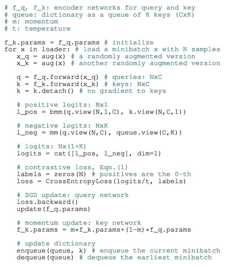 유사도는 dot product로 측정되고, 𝜏는 temperature hyper-parameter로, 확률 분포의 sharpness를 조절한다. 이러한 식을 통해 q와 k+가 유사하도록, q와 negative keys과는 멀어지도록 학습된다. 이는 unsupervised objective function으로 사용되어 인코더 네트워크를 학습시키는 기준이 된다. 또한, 이 식을 k+1 way softmax based classifier라고도 하는데, positive key 1개와 딕셔너리 내의 키 k개 중에서 쿼리와 매칭되는 정답인 positive key 1개 를 고르는 classification처럼 작동하기 때문이다. 그래서, 수도코드에서는 cross-entropy를 사용하여 loss를 계산한다.