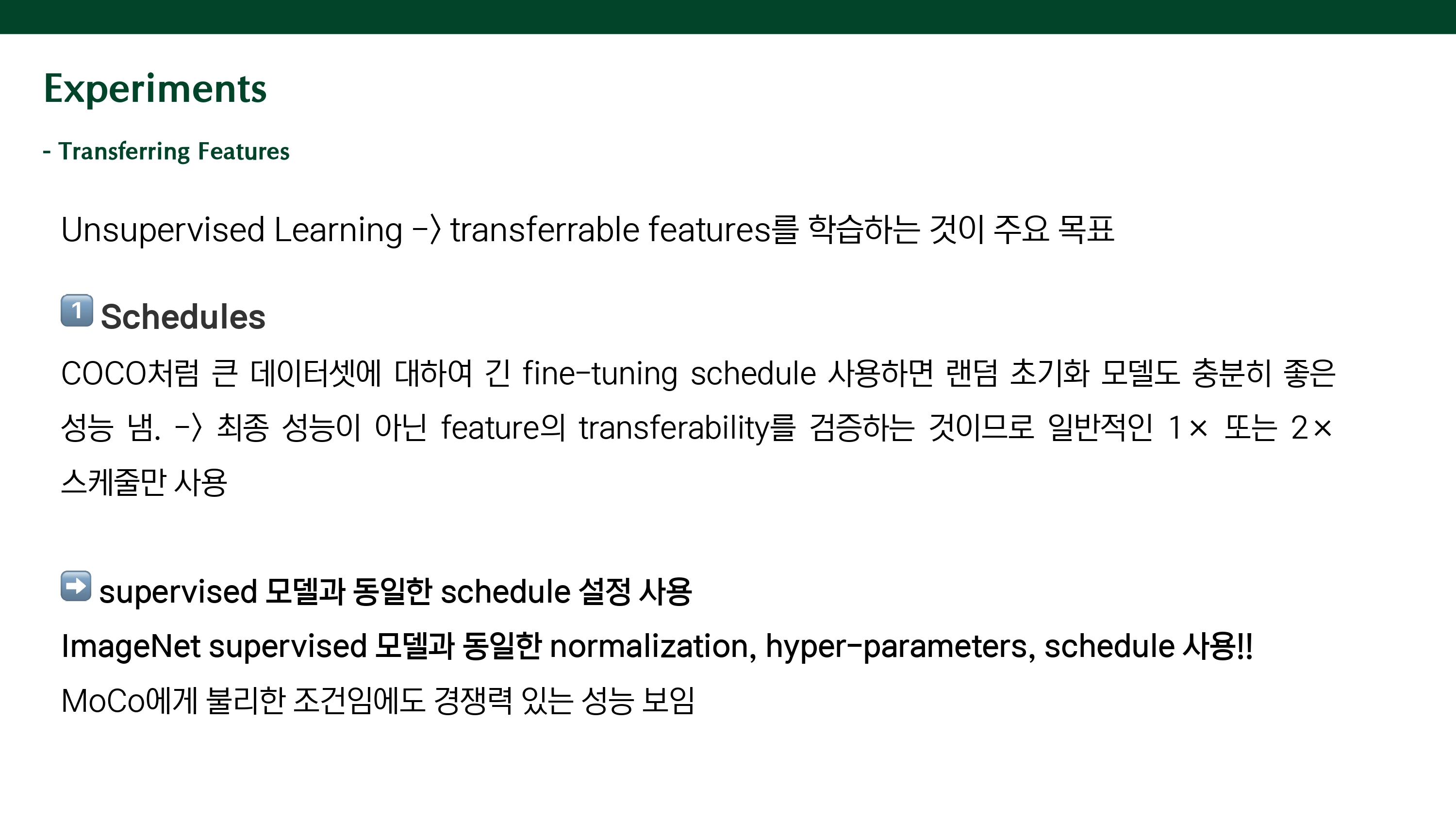 ImageNet에서 좋은 분류 성능 보였고, MoCo로 학습된 표현이 downstream task에도 잘 전이되었다. 특히, 다양한 데이터셋에서 레이블을 사용해서 학습한 모델보다 큰 마진으로 좋은 성능을 보였다.