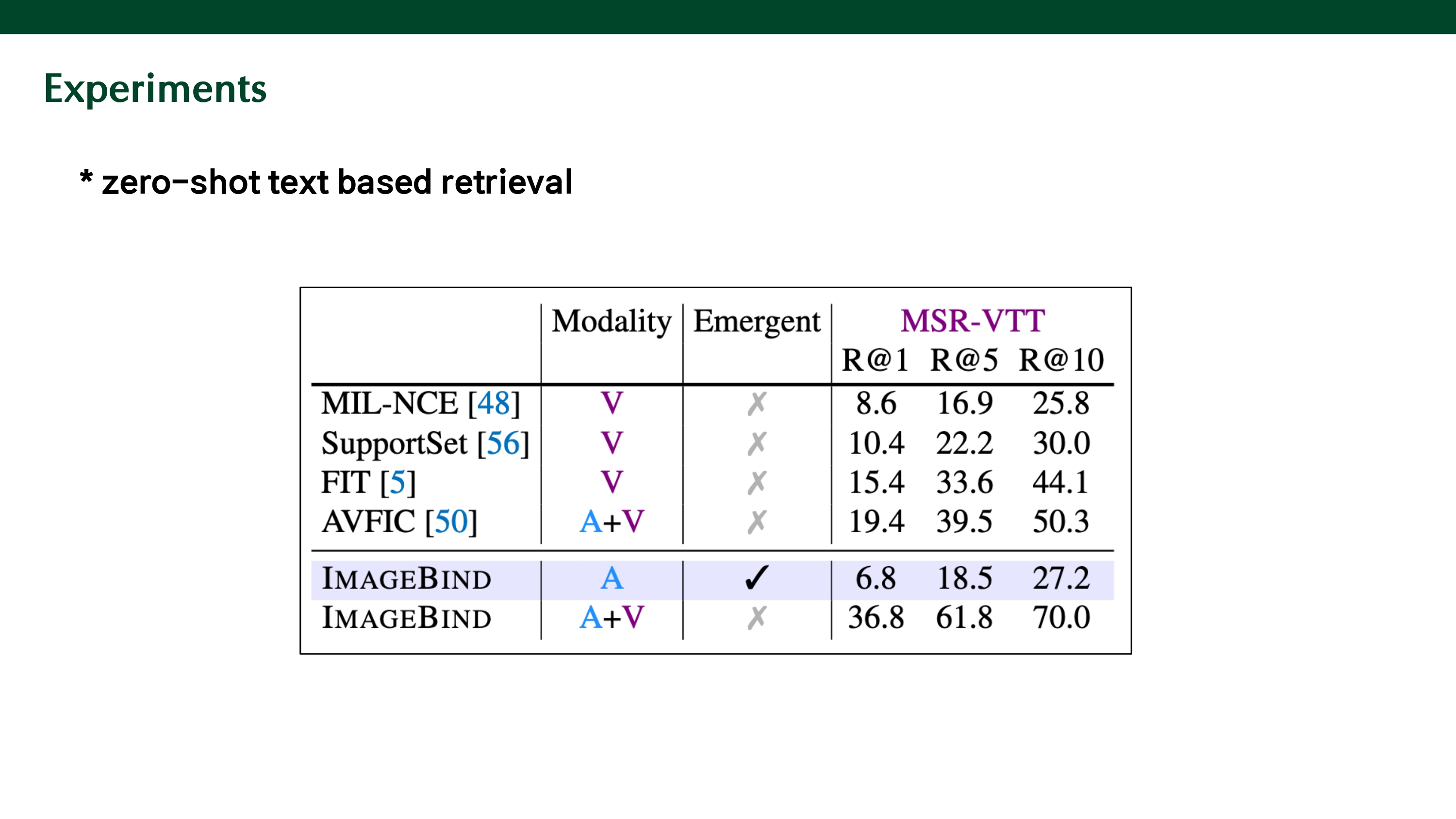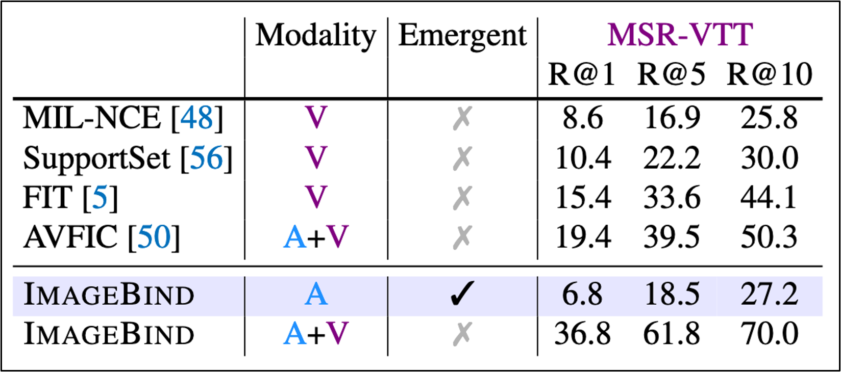 MSR-VTT 벤치마크에 대해 텍스트 기반 오디오, 비디오 retrieval을 수행한 결과이다. 마찬가지로, 텍스트-오디오 pair를 학습한 적이 없기 때문에 오디오만 사용한 경우에 emergent zero-shot ability가 발생했다고 할 수 있다. 오디오와 비디오 모달리티를 결합하여 사용한 ImageBind 방식이 기존 방법을 크게 능가하는 매우 강력한 retrieval 성능을 보였다. 이를 통해, ImageBind가 학습한 멀티모달 임베딩이 서로 보완적으로 작용하는 것을 알 수 있다.