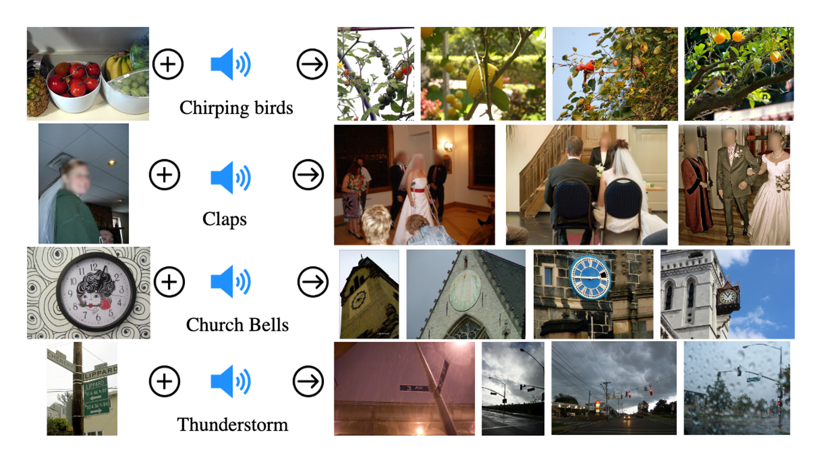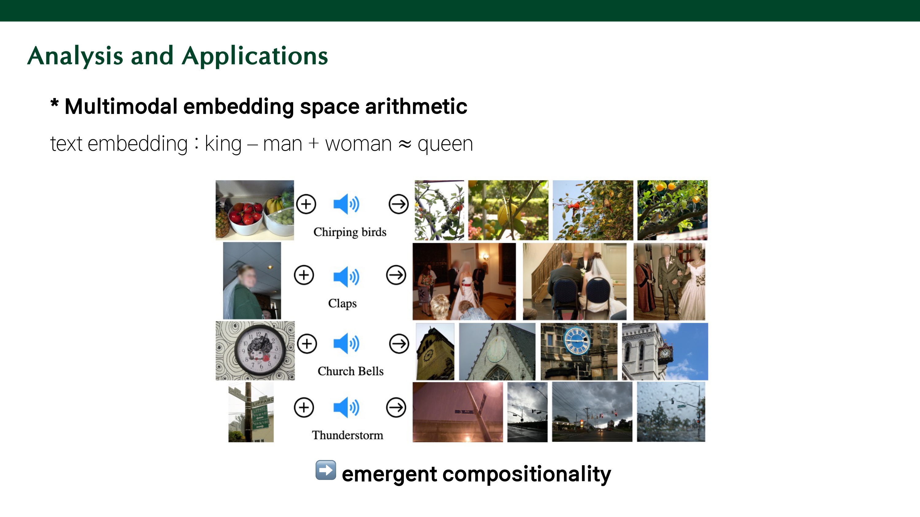 기존 텍스트 임베딩에서는 king – man + woman ≈ queen 과 같은 산술연산이 가능하다는 점이 알려져 있다. 이와 유사하게, ImageBind에서 학습된 임베딩 공간에서도 다양한 모달리티의 정보를 조합할 수 있는지 실험한 결과, figure에서처럼 이미지 임베딩과 오디오 임베딩을 더한 벡터로 이미지를 retrieval 하였을 때, 두 개념이 섞인 이미지를 반환하는 것을 알 수 있다. 이는 서로 다른 모달리티 간의 정보가 같은 임베딩 공간에 의미적으로 잘 정렬되어 있다는 것을 보여주는 emergent compositionality 능력을 의미한다.