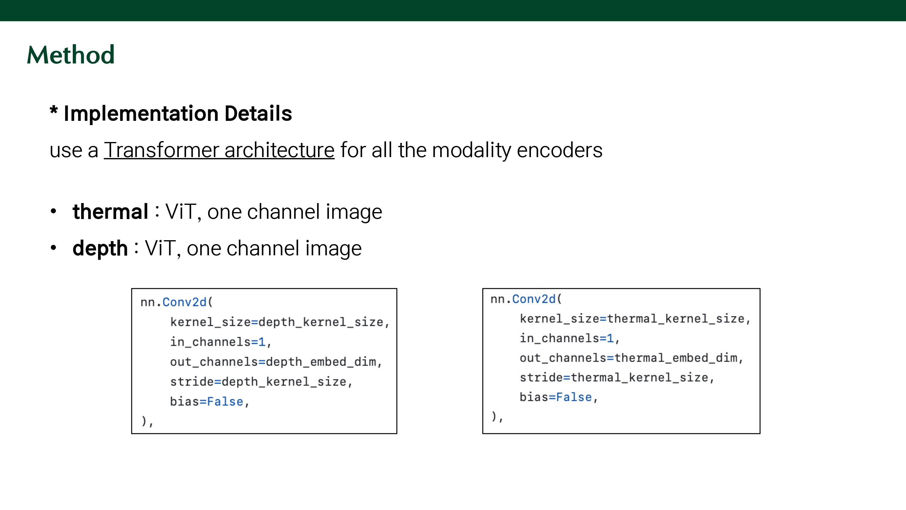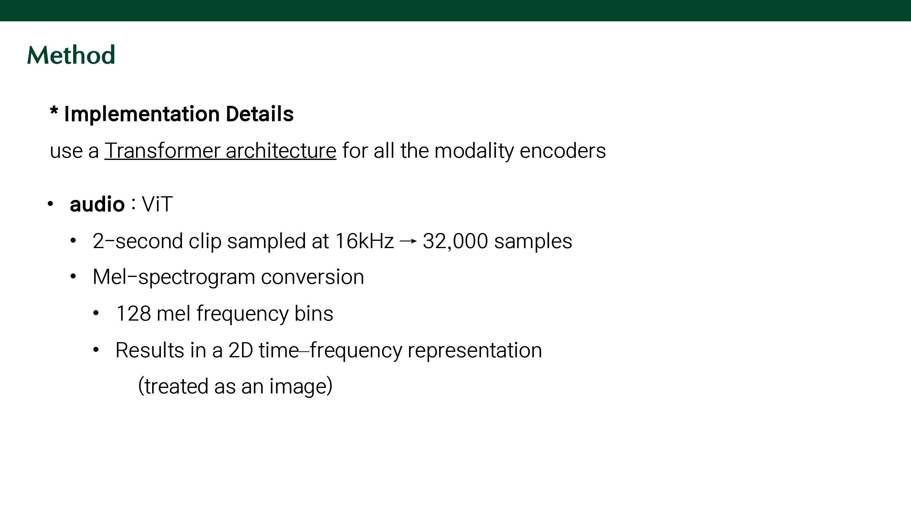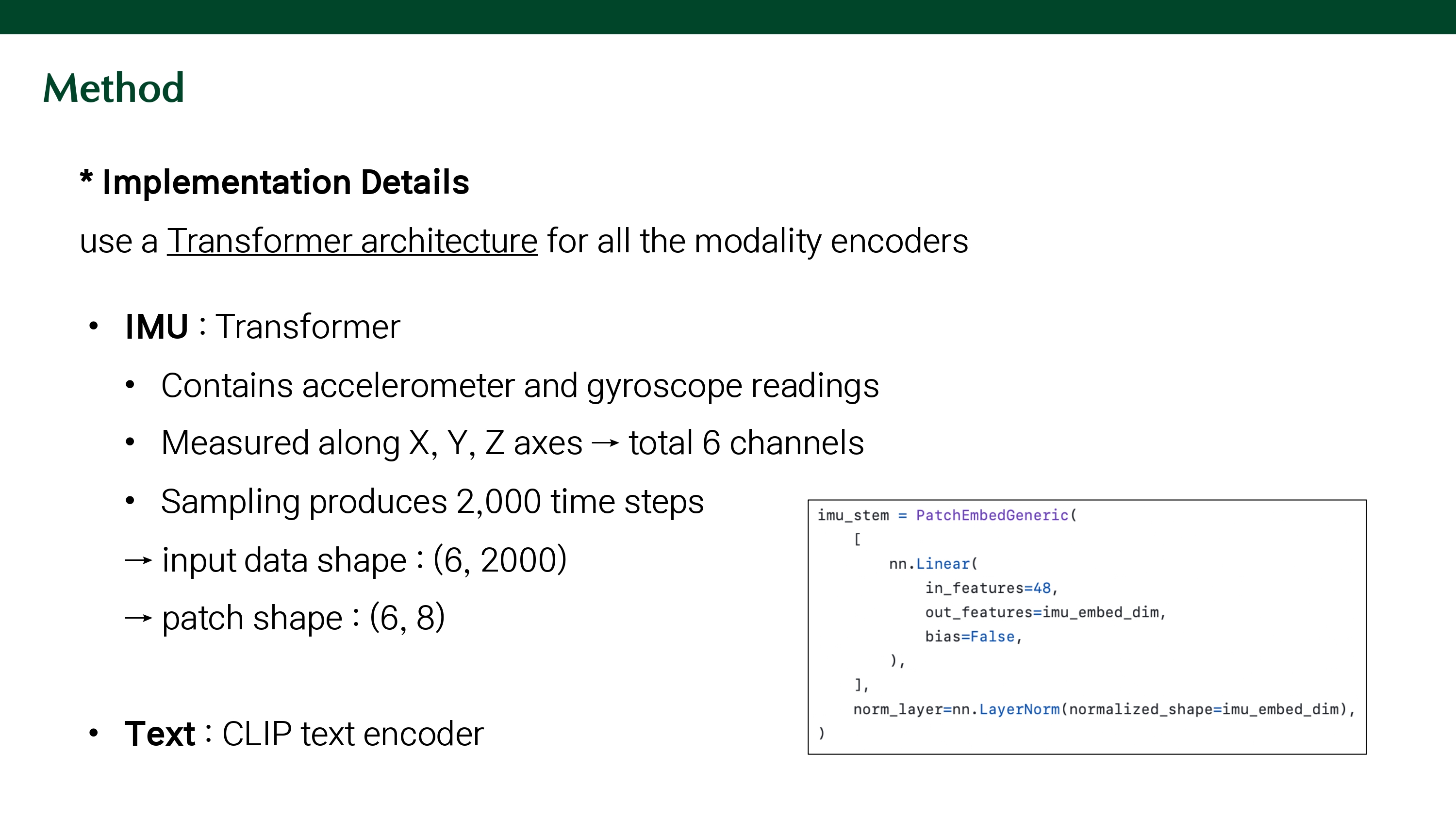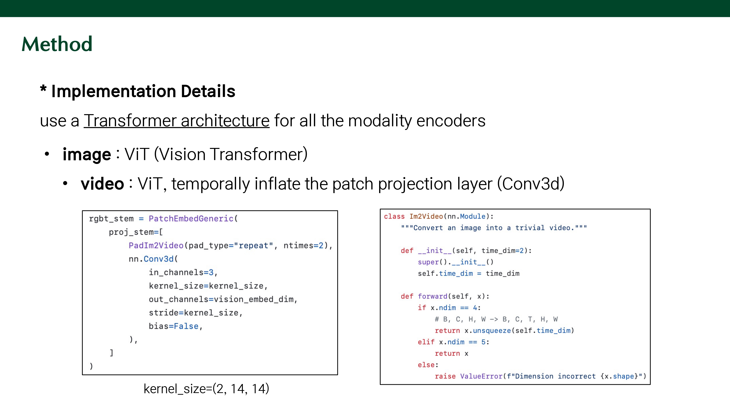 ImageBind는 모든 모달리티에 대해 encoder로 Transformer 아키텍처를 사용한다. 이미지와 비디오의 경우 모두 vision transformer (ViT)를 사용한다. ViT는 이미지를 일정 크기의 패치로 나누고, 각 패치들을 임베딩하여 토큰 시퀀스로 변환하는 구조이다. 기존 ViT는 2d 이미지를 입력으로 받기 때문에 시간 정보를 고려하지 않는다. 그런데, 비디오와 이미지를 동일 아키텍처에서 처리하기 위해서 비디오의 시간 정보를 반영하기 위해 ViT의 patch projection layer를 시간 축으로 확장해서 처리한다. 이를 위해, 2d convolution이 아닌 3d convolution을 사용한다. 오디오는 시간 축과 frequency 축으로 이루어진 mel-spectrogram으로 변환하면 2차원 이미지로 간주될 수 있어 마찬가지로 ViT를 사용한다. thermal 이미지와 depth 이미지는 컬러 이미지로 나타낼 수 있지만 실제 데이터는 각각 온도값 하나, 거리값 하나만 존재하기 때문에 흑백 이미지처럼 one channel 이미지로 취급하여 역시 ViT로 인코딩한다. IMU 데이터는 가속도와 각속도를 x, y, z 세 방향으로 측정하여 총 6개의 채널을 갖는다. 이 데이터는 (6, 2000) 형태이며, 이를 1D 패치로 분할한 뒤, 각 패치를 flatten하여 linear projection을 통해 임베딩 차원으로 매핑한다. 이는 이미지처럼 2D가 아닌 1D 시퀀스 형태여서 ViT가 아닌 일반적인 트랜스포머 구조를 사용한다. 텍스트는 CLIP의 text encoder를 사용하였다.