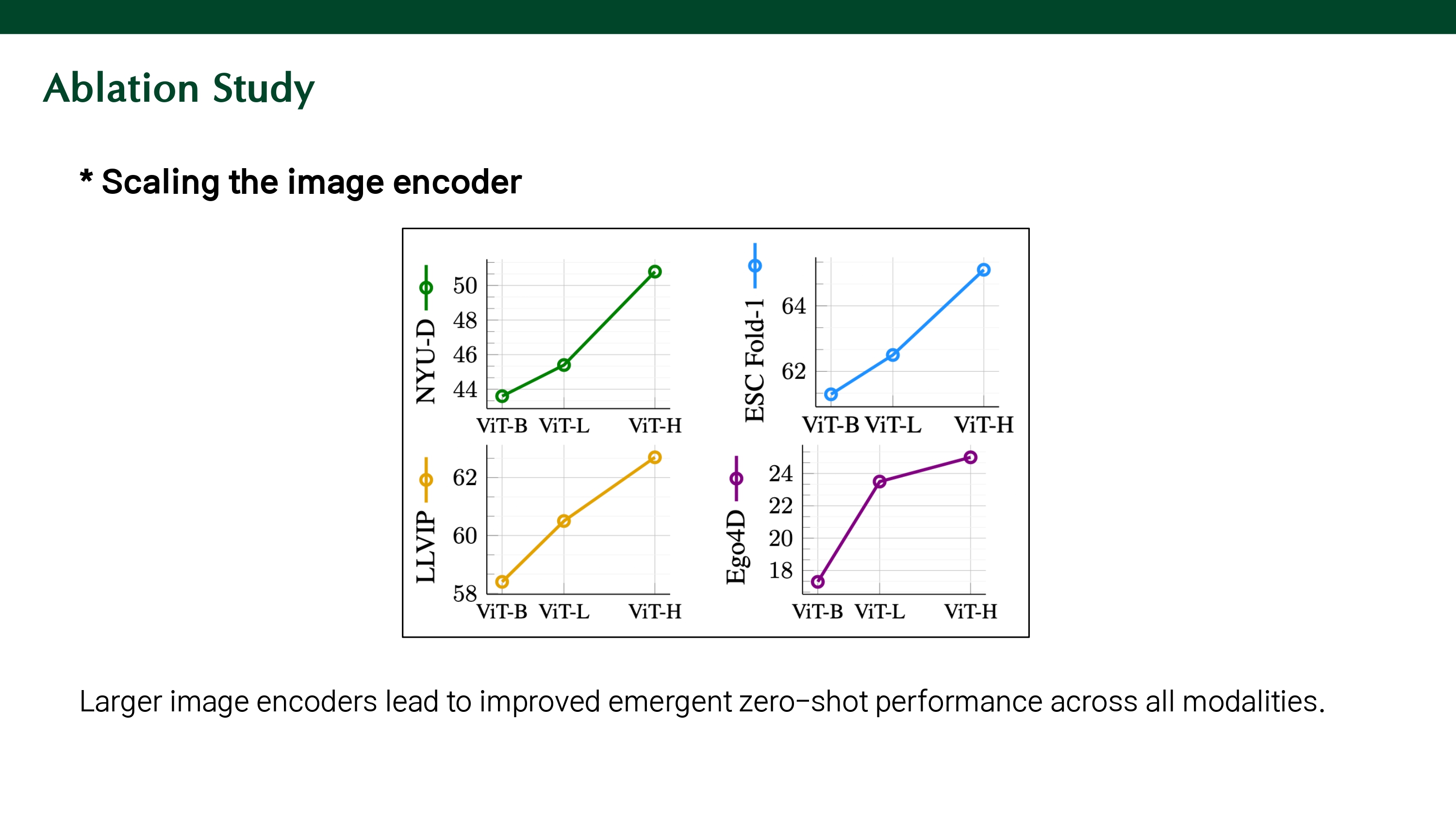 직접적인 pair를 학습하지 않은 depth, audio, thermal, IMU 모달리티에서 각 태스크를 위해 supervised된 기존 모델과 비교 가능한 수준의 성능을 보였다. 특히, depth의 경우, Text Paired baseline의 성능을 능가하는 모습을 보여 이미지 중심의 alignment 만으로 text supervision이 다양한 모달리티로 일반화 가능함을 나타낸다.