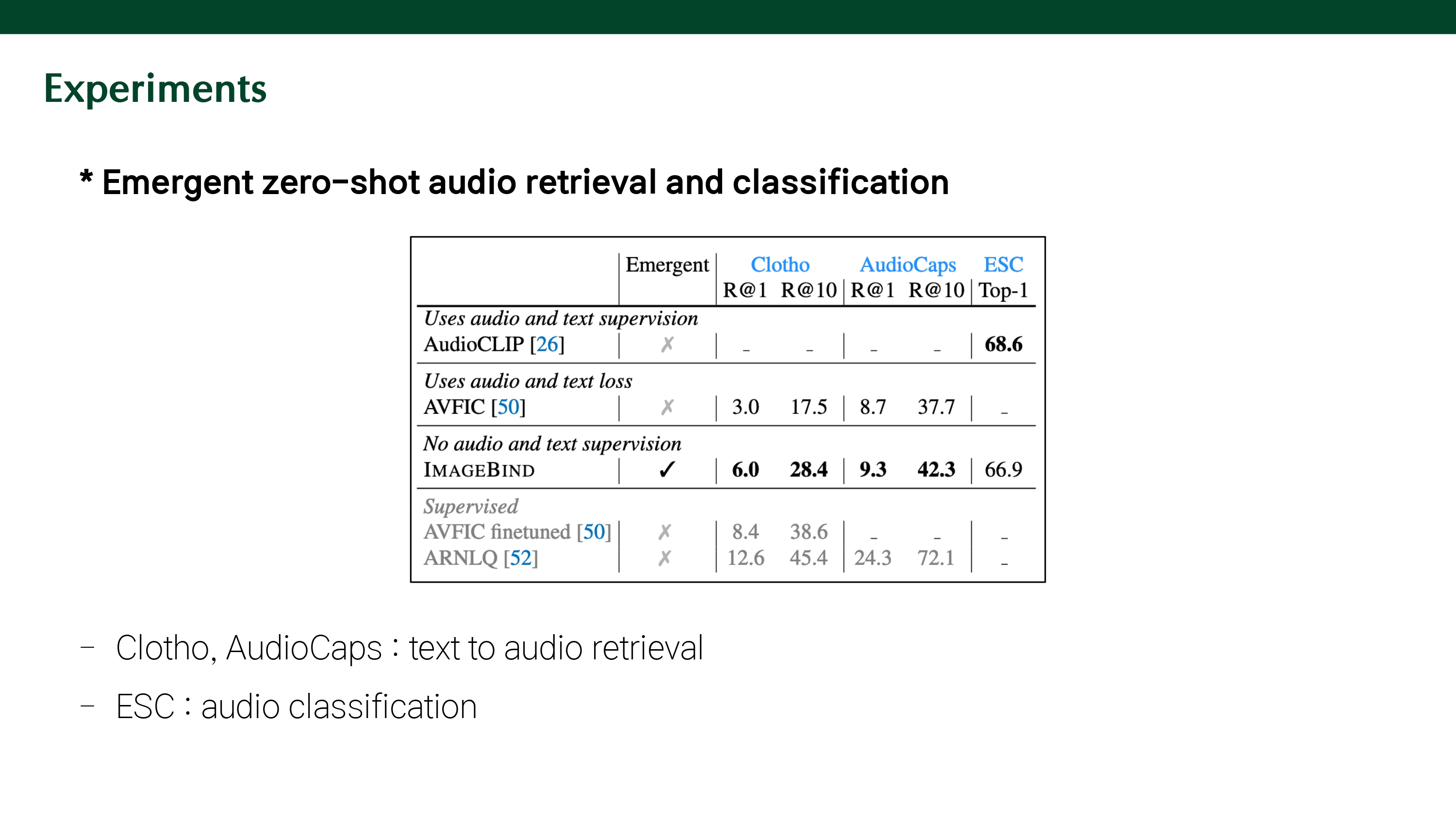 오디오-텍스트 쌍을 직접 학습하지 않아도 텍스트로 오디오를 검색하거나 분류하는 데 있어서 기존 방법과 동등하거나 능가하는 보습을 보였다. 특히, Clotho 벤치마크에 대해서 AVFIC 대비 2배의 성능 향상을 보였다. AudioCLIP 모델은 AudioSet 데이터셋의 클래스 이름을 text supervision으로 사용하였는데, ImageBind가 ESC 벤치마크에서 AudioCLIP과 유사한 성능을 보였다.