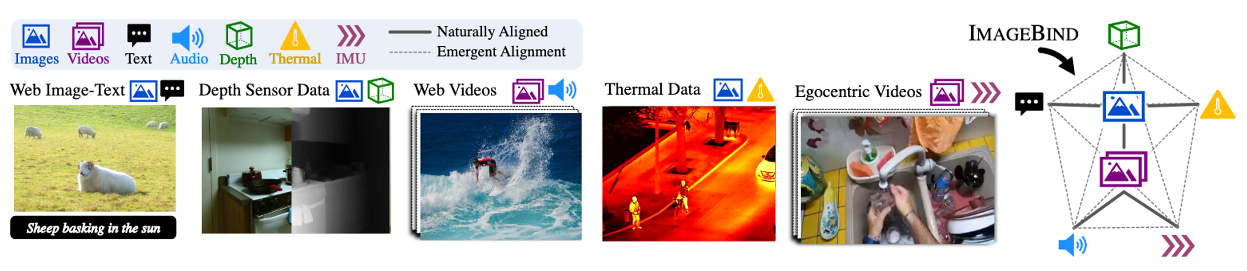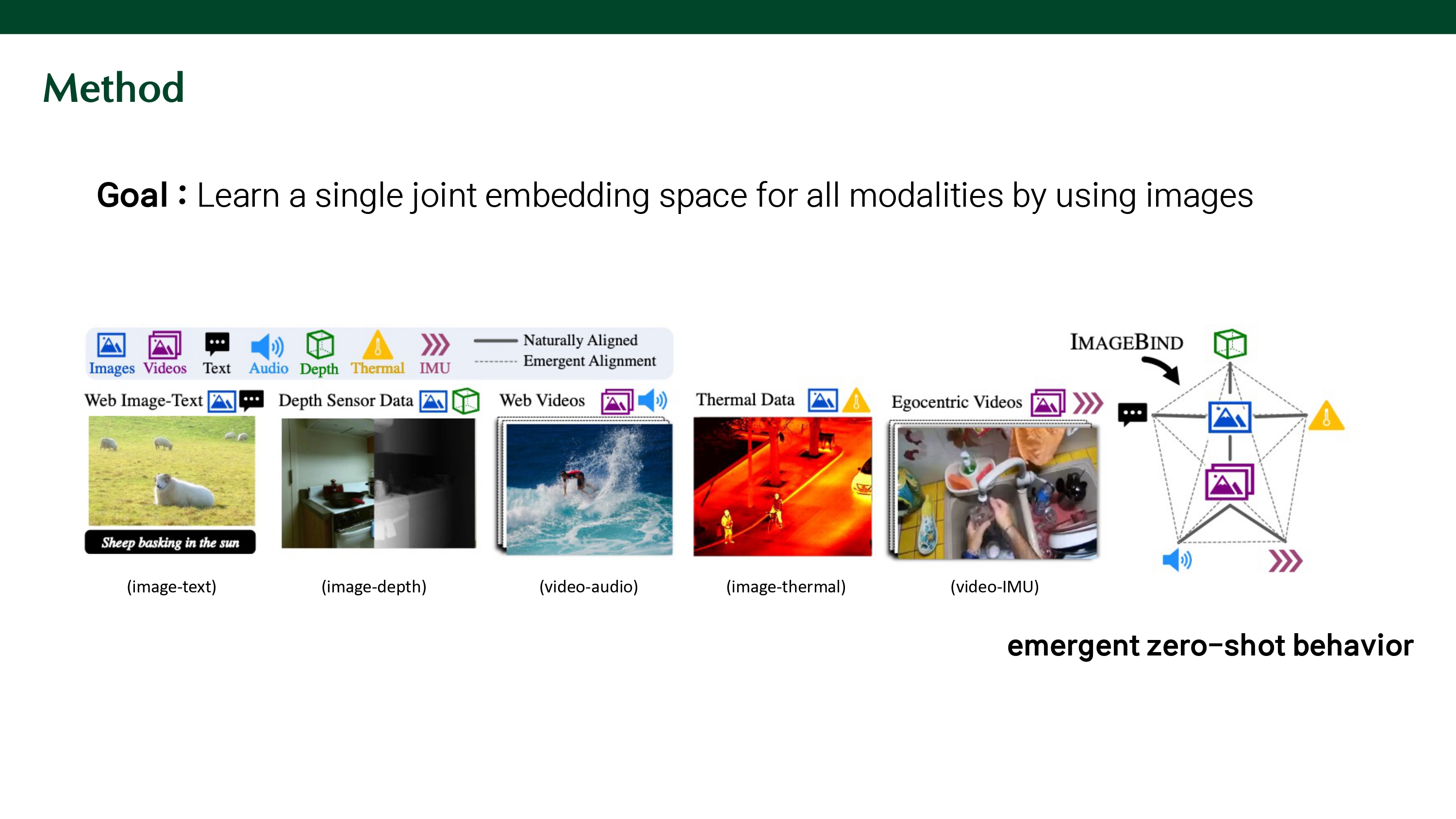 인간에게 있어서 이미지는 다양한 경험을 결합하도록 하는 강력한 매개체이다. 이러한 이미지의 binding property는 visual feature를 학습하는 supervision으로 활용될 수 있다. 이에 모델이 인간처럼 binding을 수행하기 위해서는 visual feature가 모든 센서 모달리티와 align 되어 있는 single *joint embedding space를 만들어야 한다. 이를 위해서 동일한 이미지를 기반으로, 가능한 모든 모달리티 조합 간의 paired data가 필요하지만, 이러한 데이터를 얻거나 만드는 것은 매우 힘든 일이다.
