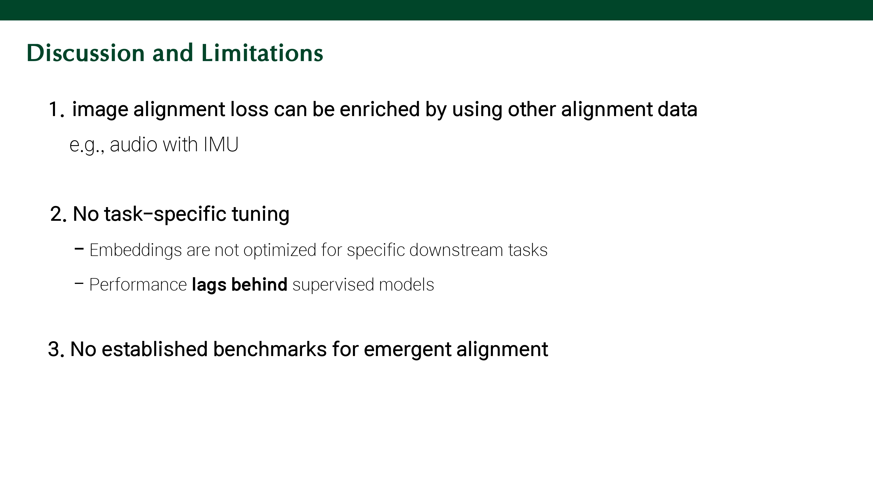 기존 연구들은 이미지-텍스트, 이미지-오디오처럼 이미지와 하나의 모달리티만 align하여 학습하는 방법이 많은데, 이렇게 얻은 final embedding은 학습에 사용된 모달리티 조합에만 잘 작동하게 되어 다른 모달리티에 대한 일반화 능력이 떨어진다. 또, joint embedding을 학습하는 것에 있어서 가장 큰 제한점은 앞서 말했듯이 모든 모달리티 쌍이 존재하는 대규모 멀티모달 데이터가 없다는 것이다.