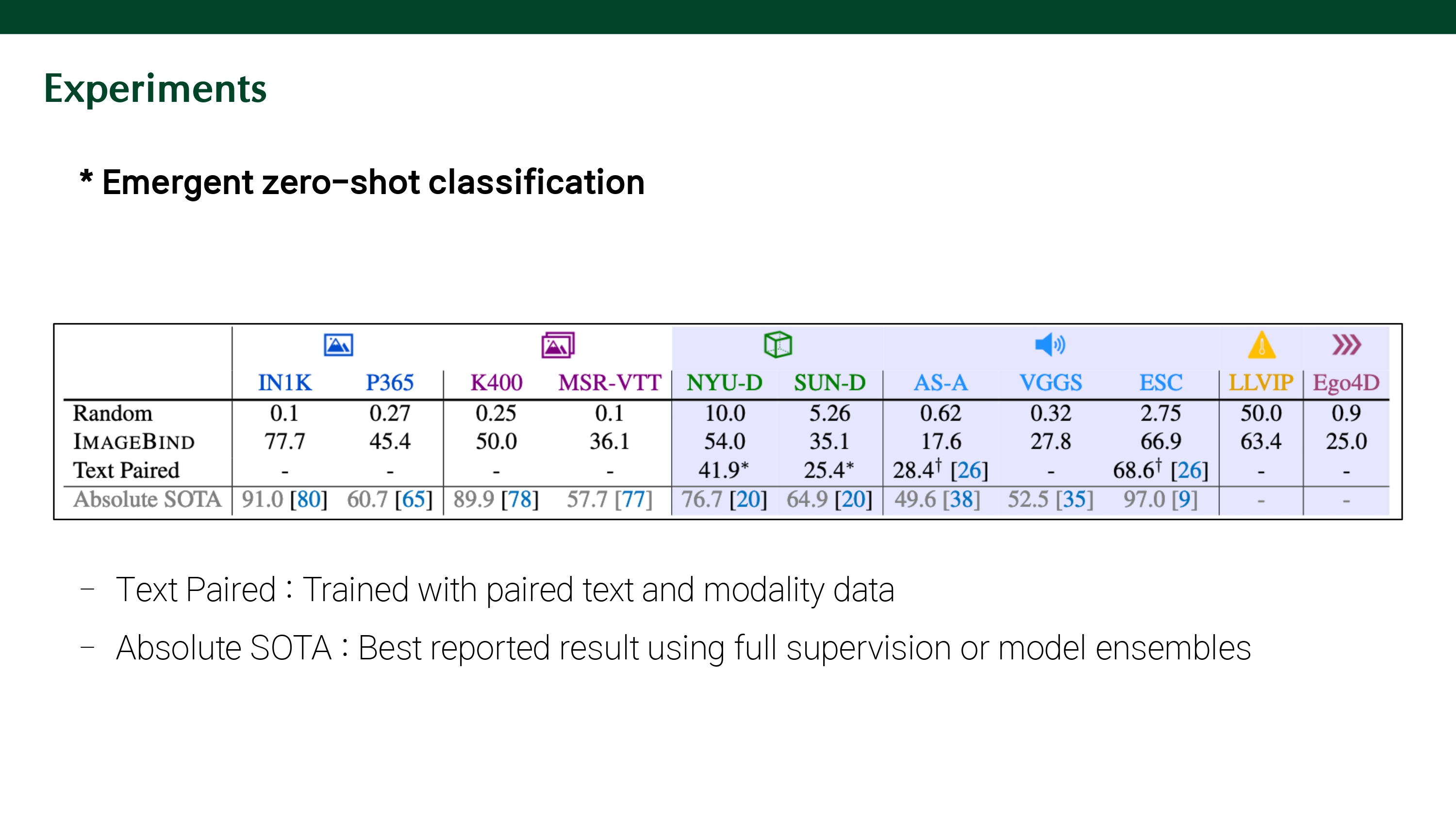 텍스트 프롬프트로 각 모달리티에 대한 classification 성능을 확인하여 텍스트 임베딩이 다른 모달리티와 얼마나 잘 정렬되어 있는지를 측정하는 실험이다. 파란색으로 하이라이트가 된 부분은 emergent zero-shot classification이 나타난 것으로, 이 능력에 대해 직접적인 학습이 이루어지지 않았기 때문에 emergent라는 용어를 사용한다. Text Paired는 각 모달리티의 데이터를 grayscale 이미지로 변환하여 CLIP으로 캡셔한 텍스트 데이터와 모달리티 데이터 쌍을 학습한 것이다. Absolute SOTA는 각 벤치마크에서의 최고 supervised 성능이다.