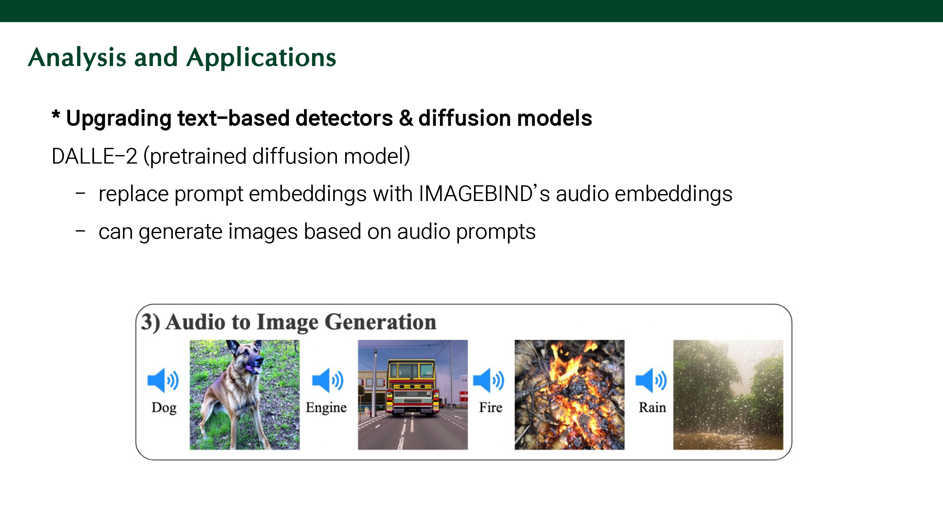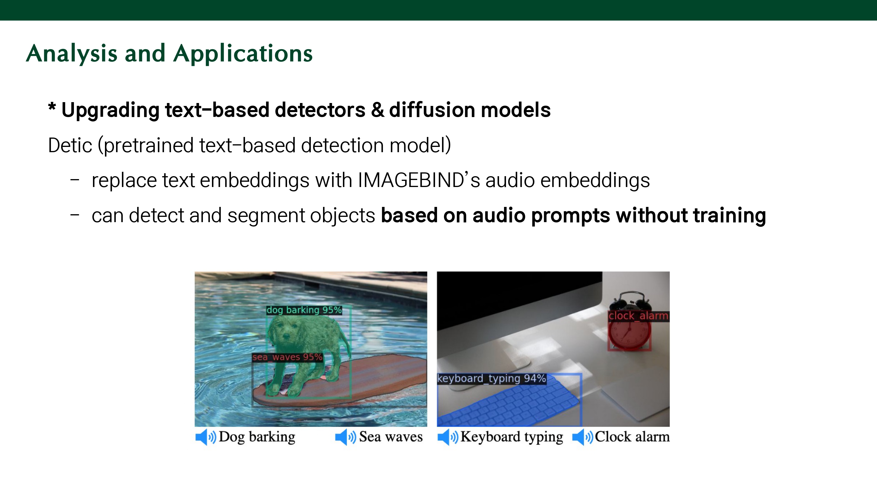 이러한 멀티모달 임베딩을 활용해 기존의 텍스트 기반 모델을 오디오 기반 모델로 확장할 수 있다. pre-trained된 텍스트 기반 detection 모델인 Detic의 텍스트 임베딩을 ImageBind의 오디오 임베딩으로 교체하면 학습 없이도 오디오 기반 detection과 segmentation을 수행할 수 있다. 또한, pre-trained된 DALLE-2 모델의 프롬프트 임베딩을 마찬가지로 ImageBind의 오디오 임베딩으로 교체했을 때 오디오에 기반하여 이미지 생성이 가능하다.
