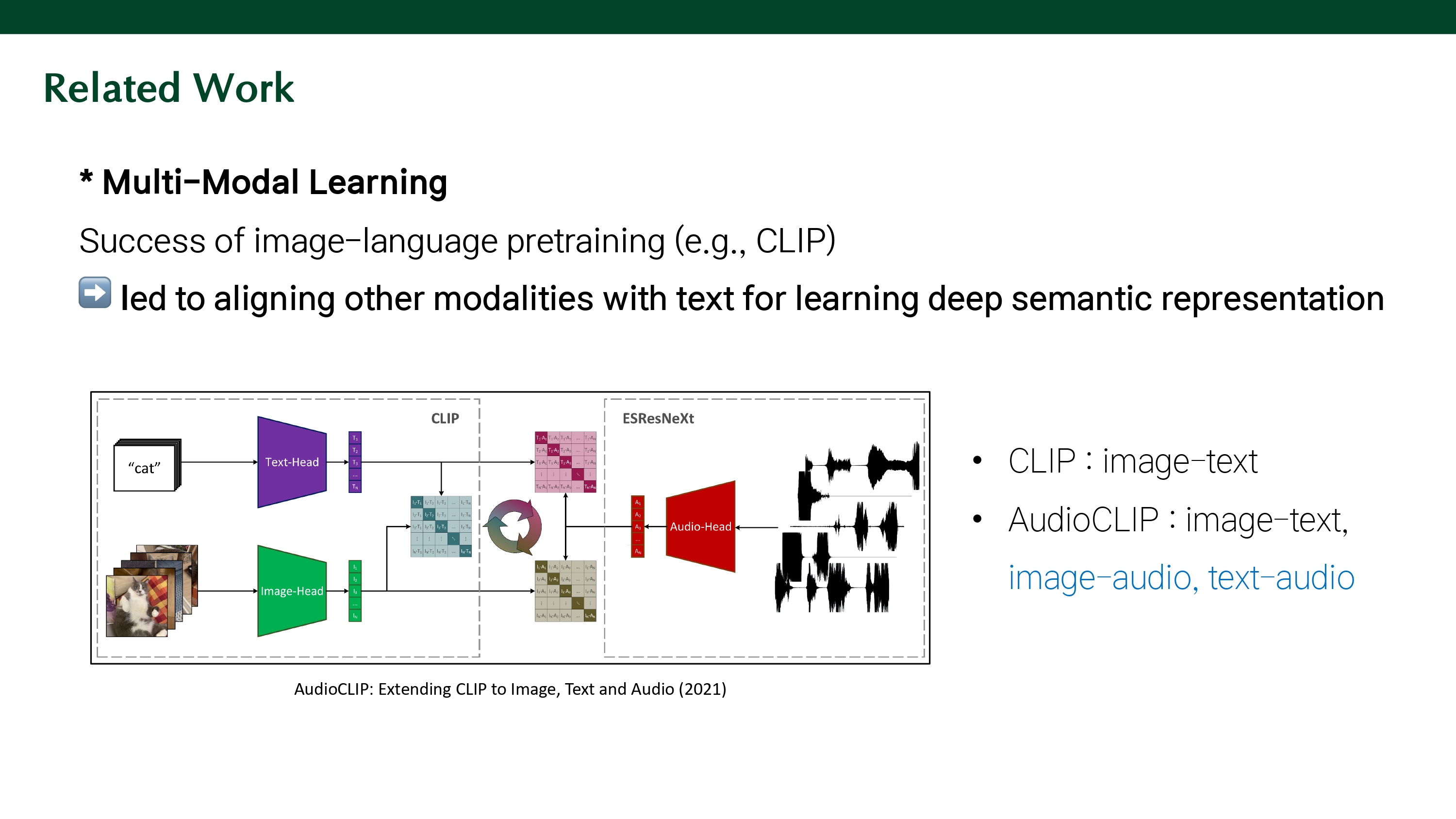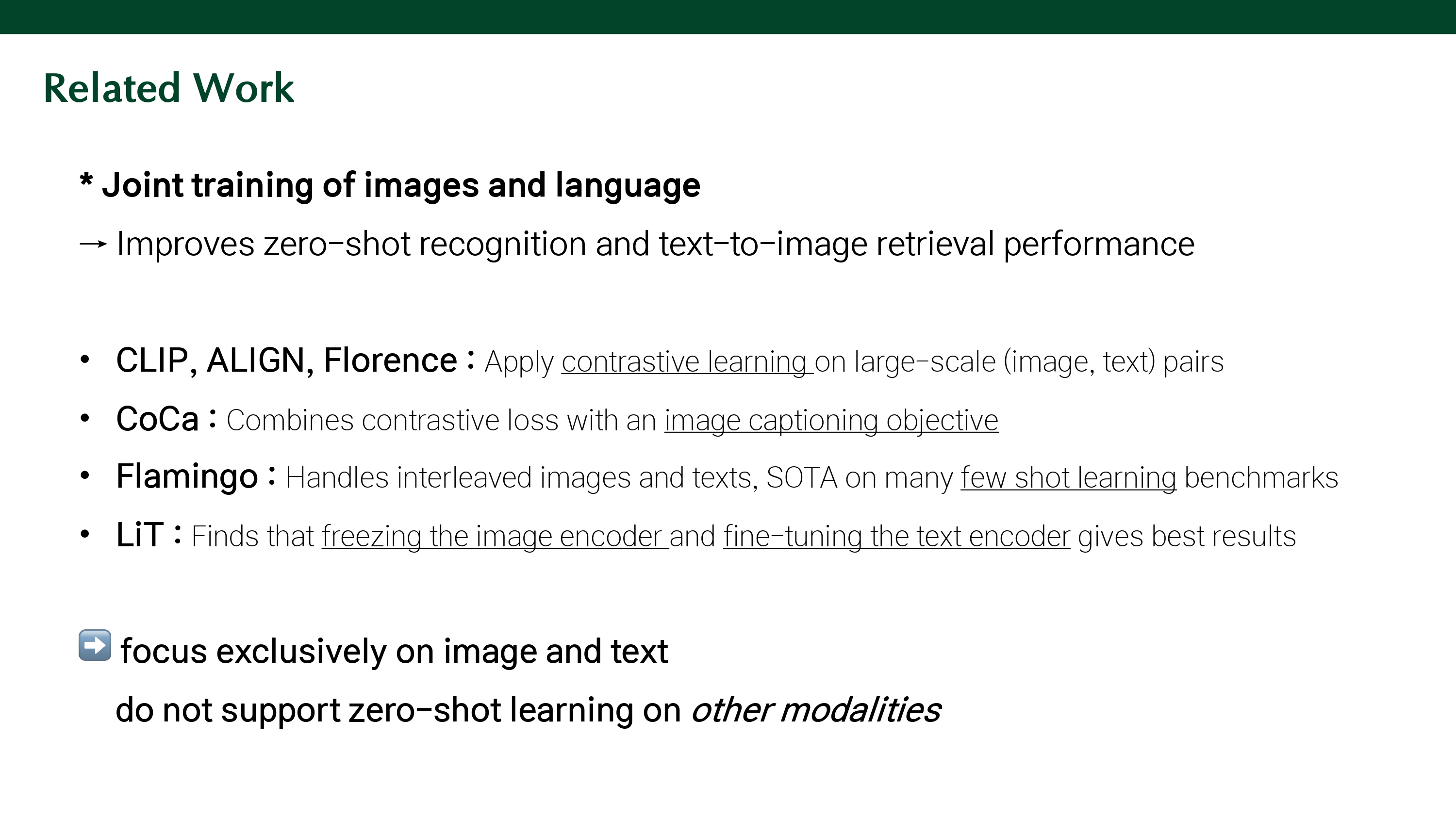 기존 연구에 따르면, image와 language를 함께 학습하는 것이 zero-shot recognition이나 text-to-image retrieval에 매우 효과적임이 증명되었다. CLIP, ALIGN, CoCa, Flamingo와 같은 모델들이 그 예시이다. 그런데, 이 모델들은 이미지와 텍스트 모달리티에만 집중한 것으로 그 외의 모달리티에 대한 zero-shot 성능을 기대하기가 어렵다.