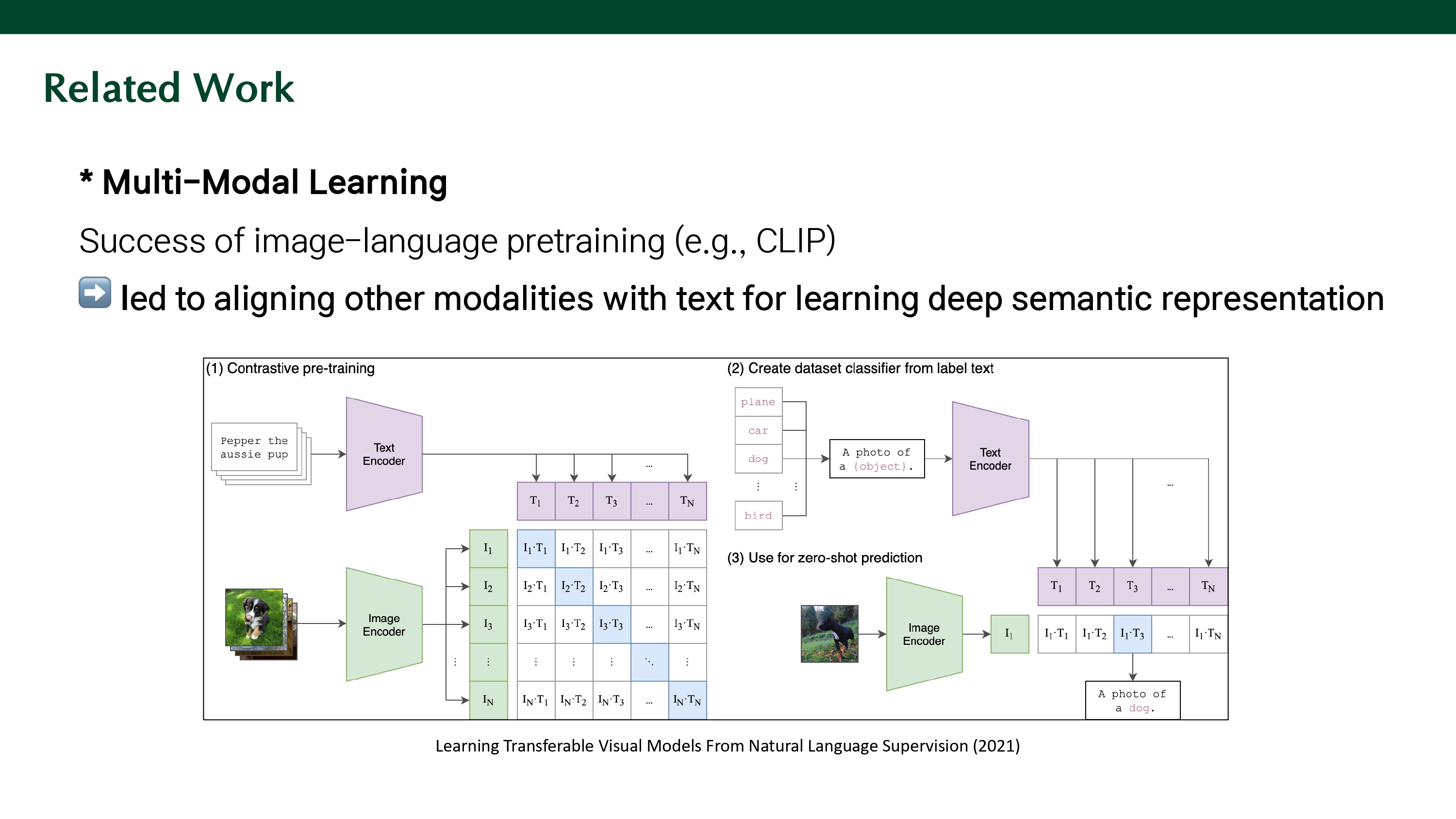 앞선 모델 중, CLIP에 조금 더 집중을 해보면, CLIP은 대규모 이미지와 텍스트 데이터의 pair를 학습하는 모델이다. 이미지 인코더와 텍스트 인코더는 각각의 입력을 임베딩 공간으로 매핑하며, 임베딩 간의 cosine similarity를 contrastive learning으로 학습한다. 이를 통해, 텍스트 프롬프트만으로도 학습하지 않은 이미지를 분류할 수 있는 zero-shot classification이 가능하다. CLIP처럼 image-language pre-training 방법이 크게 성공하면서, CLIP을 사용하여 다른 모달리티를 linguistic input과 align하여 semantic representation을 학습하는 시도가 늘어나게 되었다.