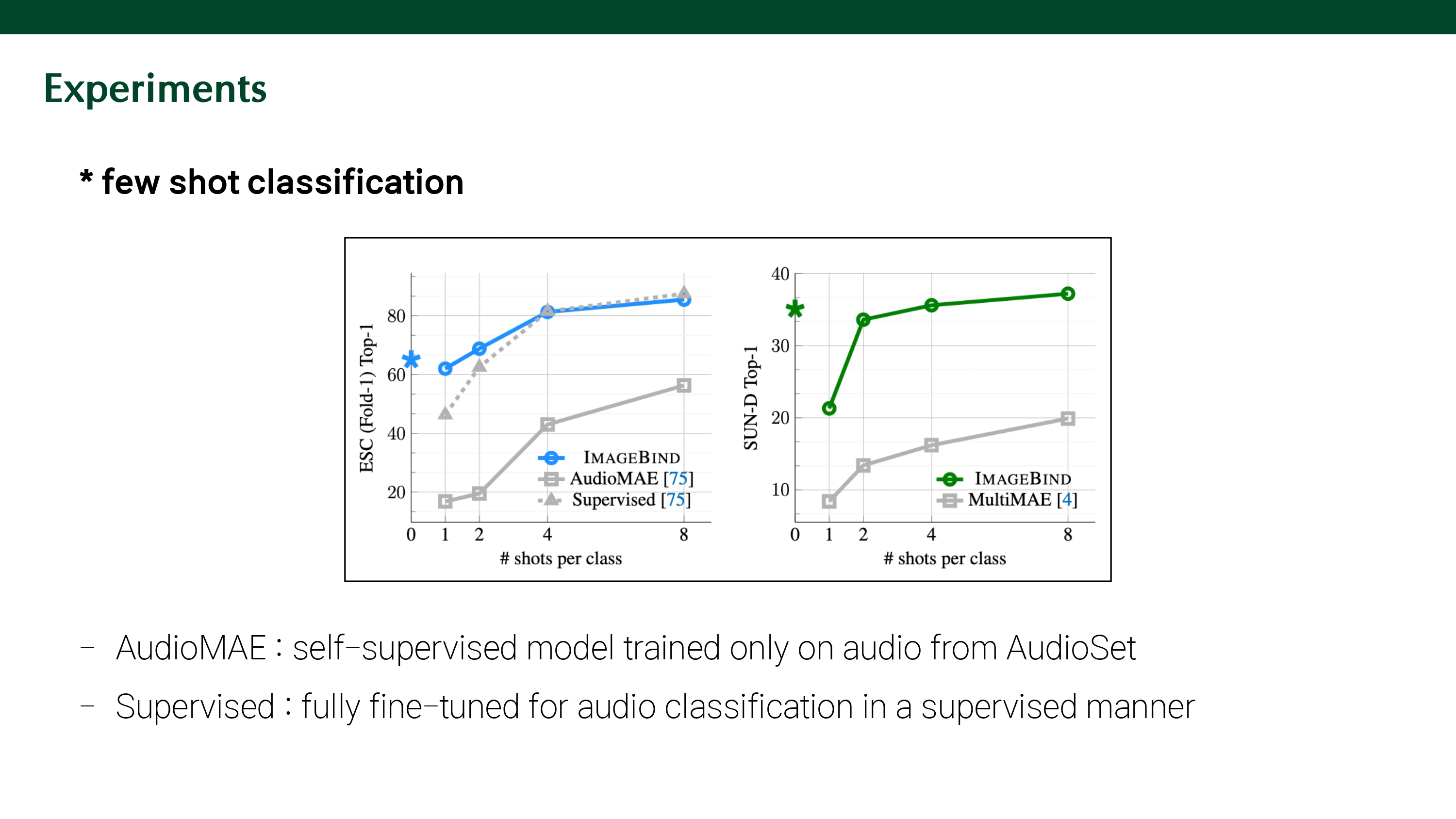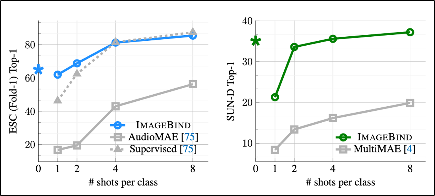 figure의 왼쪽에서 ImageBind는 self-supervised 모델인 AudioMAE와 fully supervised 모델인 Supervised 보다 zero에서 4- shots에서 최대 40%의 차이를 보이며 성능 우위를 보였다. zero-shot 성능도 supervised 모델의 two shots 성능보다 좋은 것을 알 수 있다. 오른쪽의 depth classification에서는 이미지, depth, semantic segmentation masks에 학습된 MultiMAE 모델과 비교하였을 때, 큰 성능 차이로 우수한 성능을 보였다.