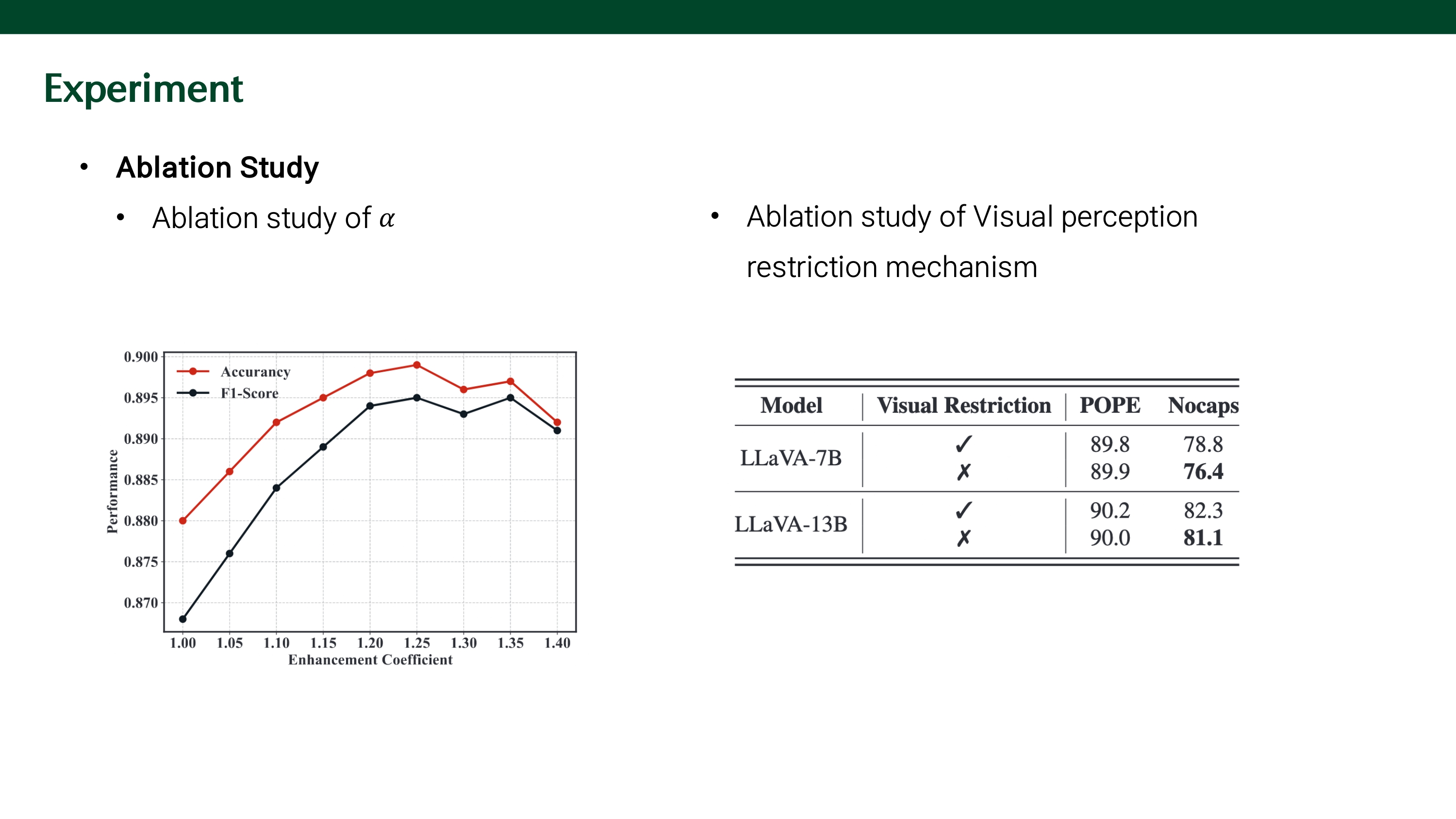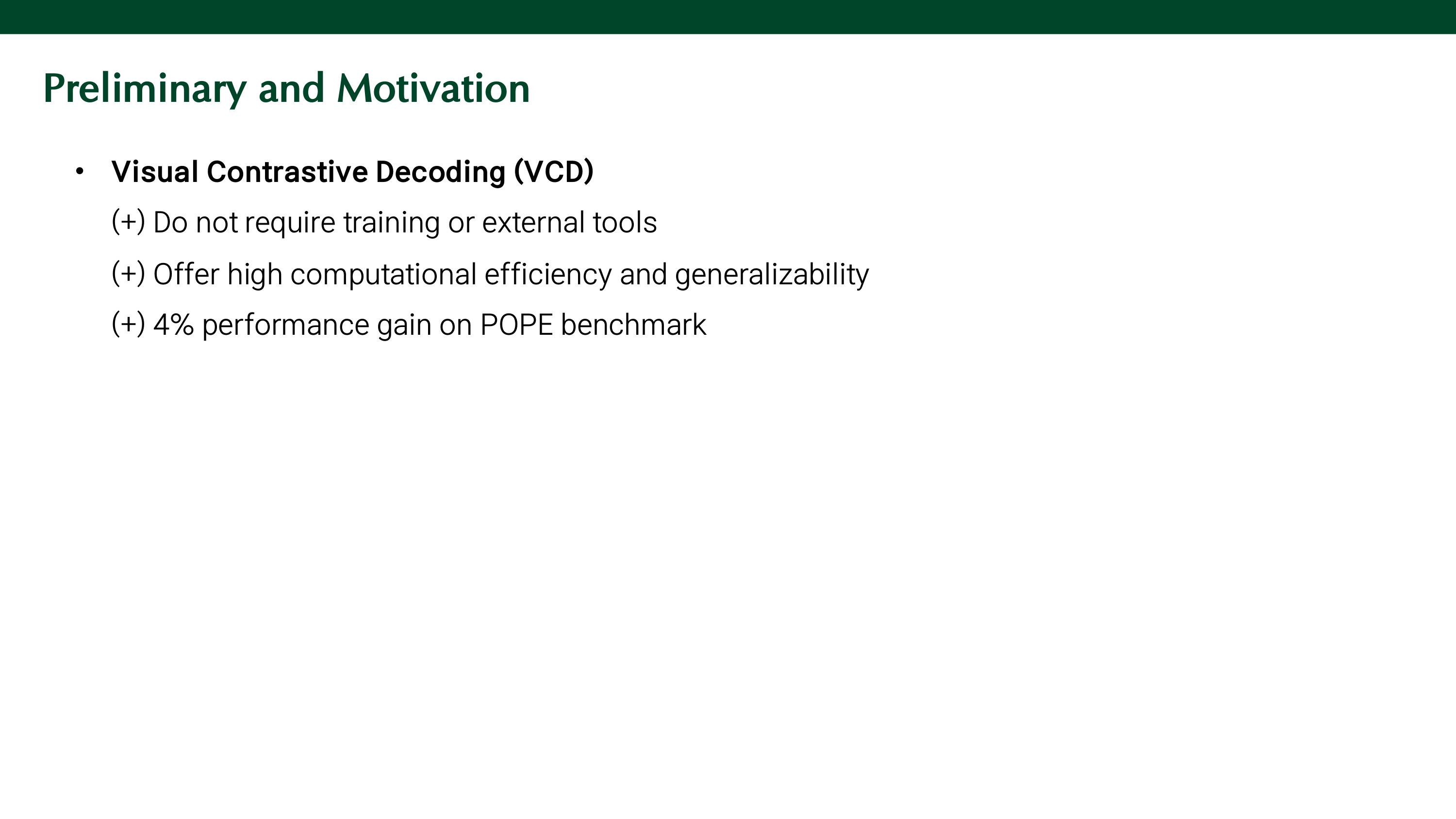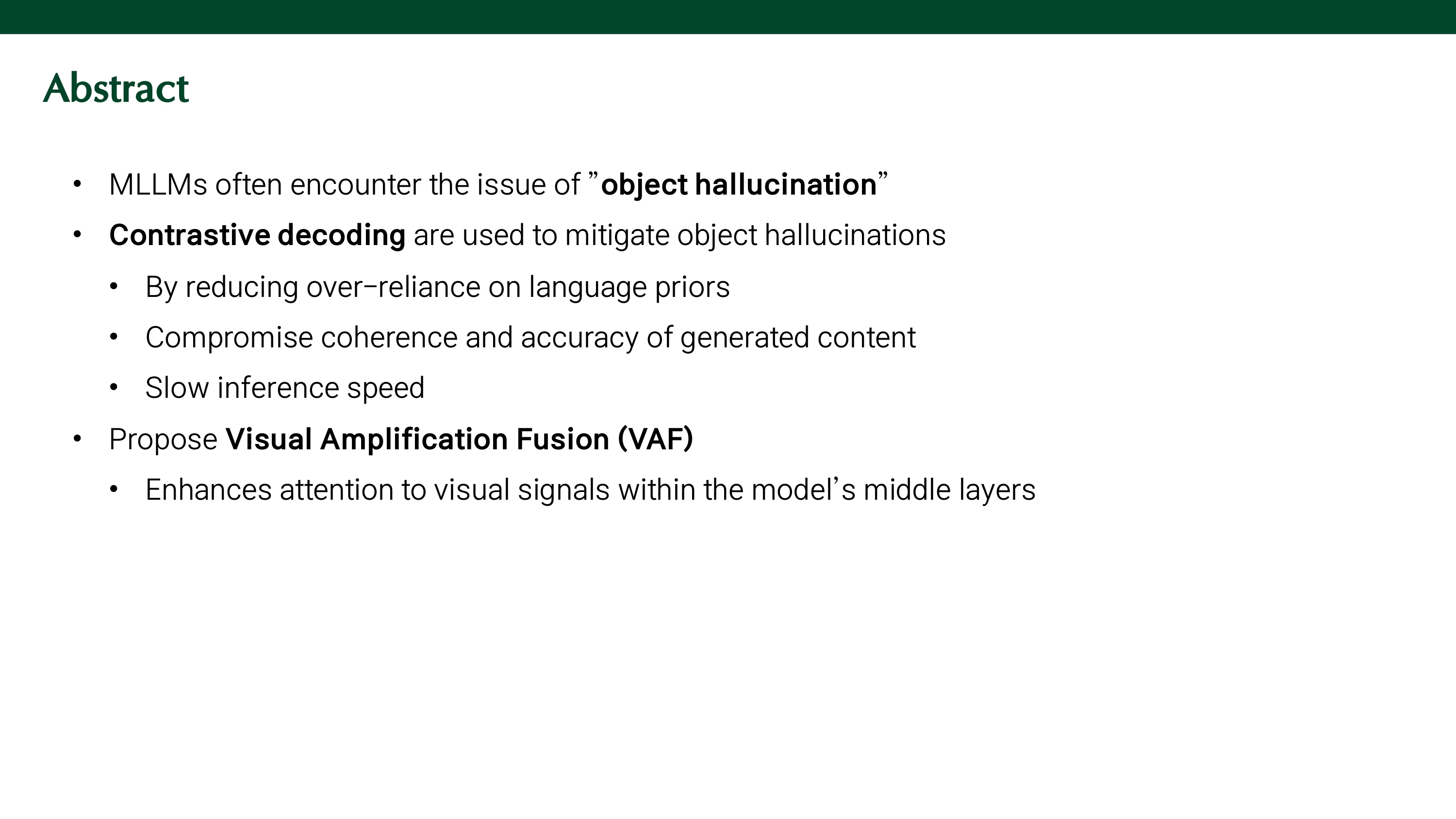 본 논문의 분석 결과, hallucination의 원인은 language priors에 대한 over-reliance 때문이 아닌, modality fusion 과정에서 visual information에 대한 attention이 불충분하기 때문이었다. 이에, modality fusion이 강하게 발생하는 middle layer의 visual signal에 대한 attention을 증가시키는 Visaul Amplification Fusion (VAF)을 제안한다. 이를 통해, visual features를 더 잘 포착하게 하여 hallucination을 줄일 뿐만 아니라 language priors를 유지할 수 있다. 또한, contrastive sample을 처리할 필요가 없기 때문에 속도 저하가 없다.