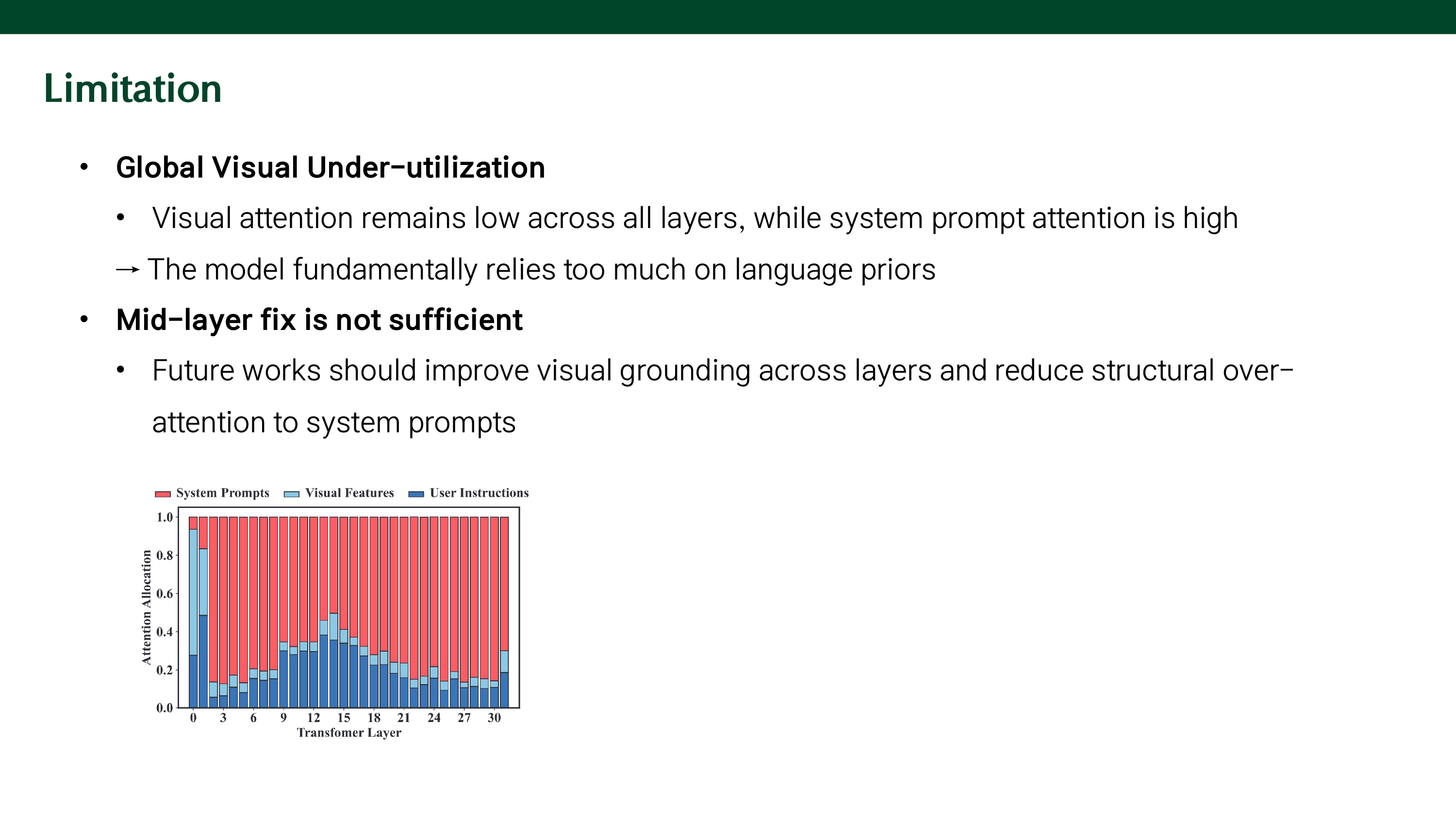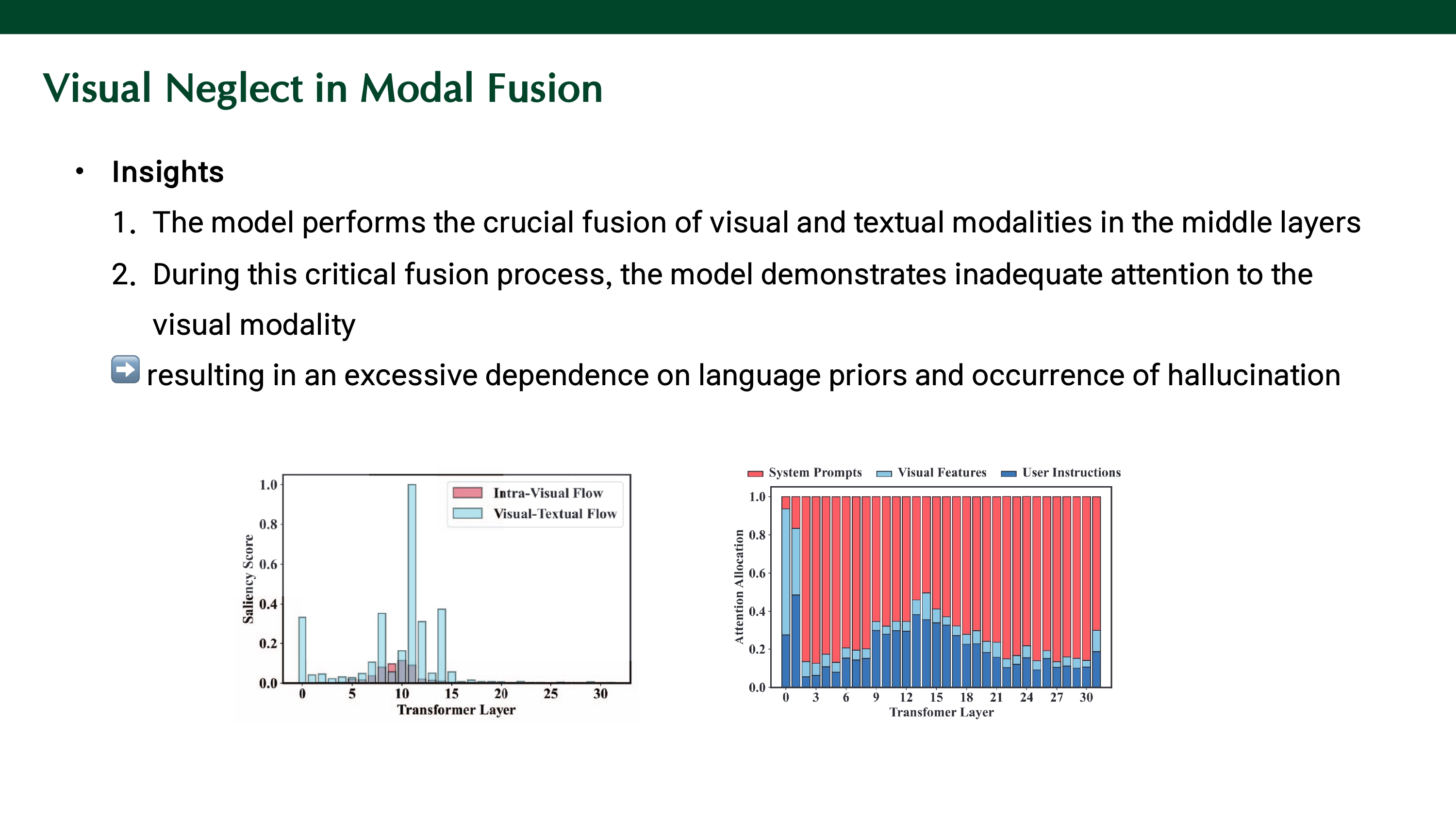 modality fusion이 활발하게 발생하는 middle layer에서 visual features에 대한 attention이 system prompt, user instructions에 할당된 attention보다 낮다. 즉, visual information을 덜 활용하기 때문에 language priors에 과하게 의존하게 되는 것이다.