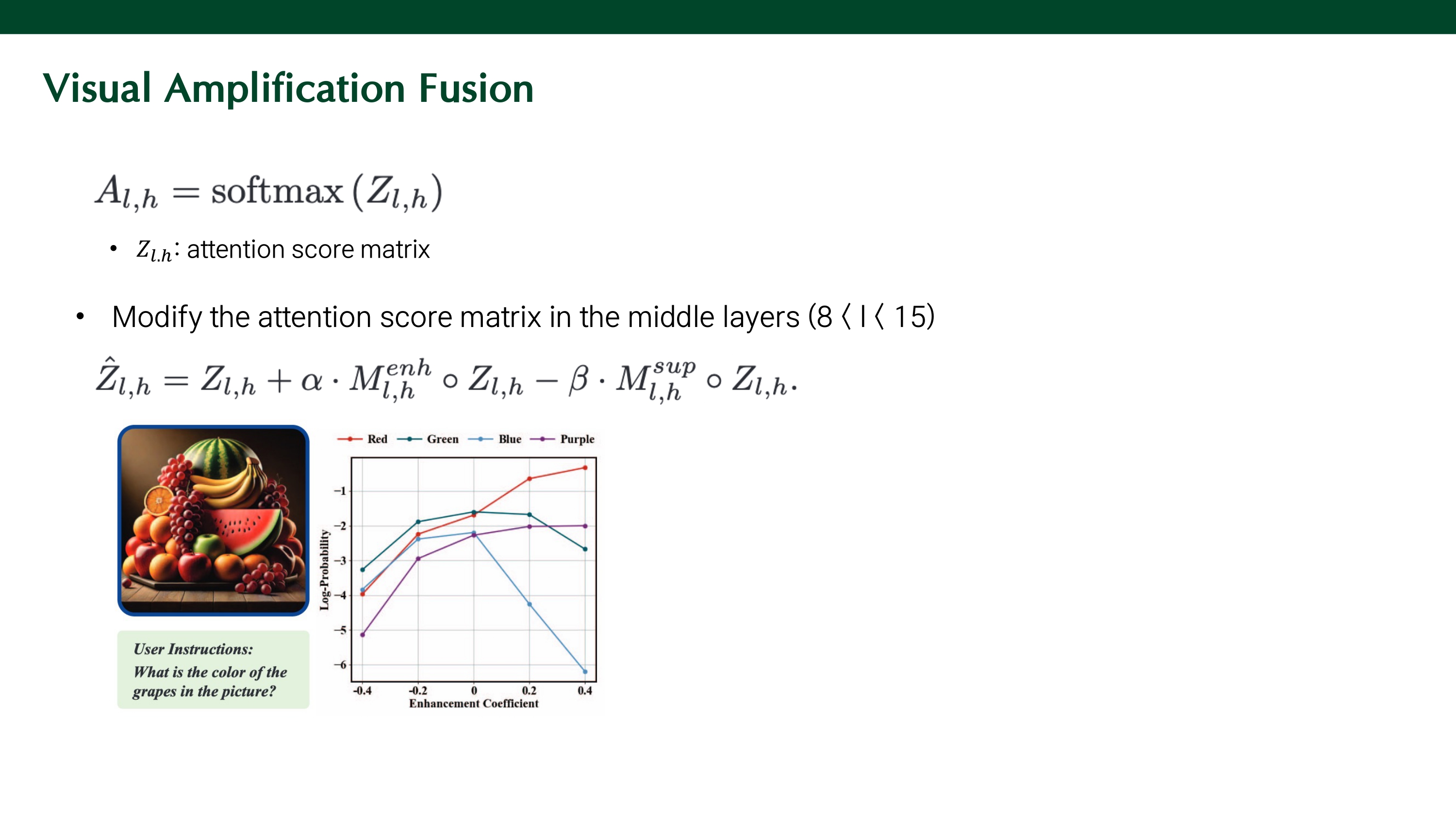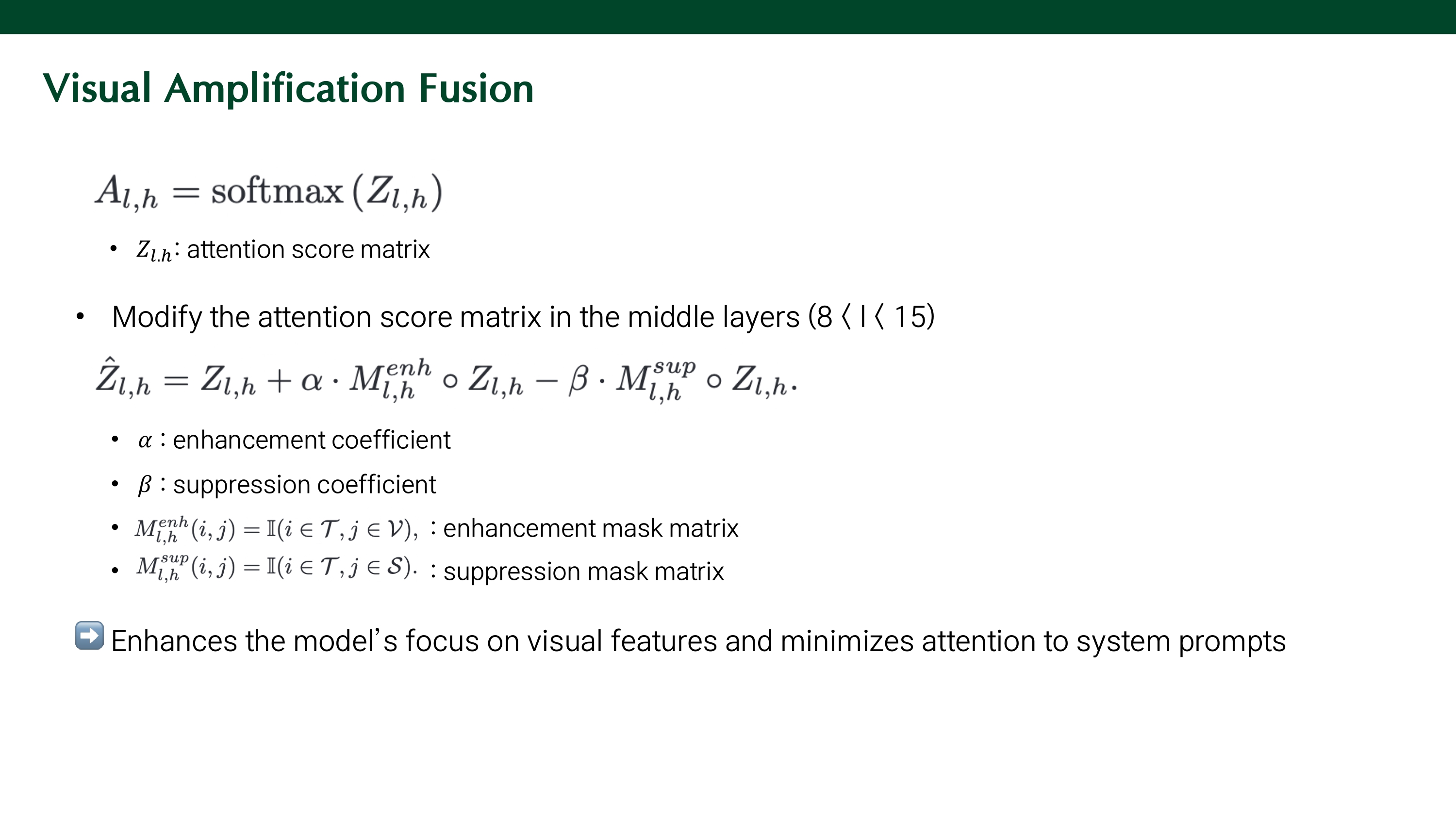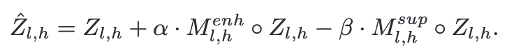visual token에 더 많은 attention을 부여하기 위해 softmax를 적용하는 attention score를 조정한다. $M^{enh}$는 enhancement mask matrix로, insturction이 참고하는 visual token만 강화하기 위해 사용하는 마스크이다. $M^{sup}$는 suppression mask matrix로, instruction이 참고하는 system prompt token을 억제하기 위해 사용하는 마스크이다.