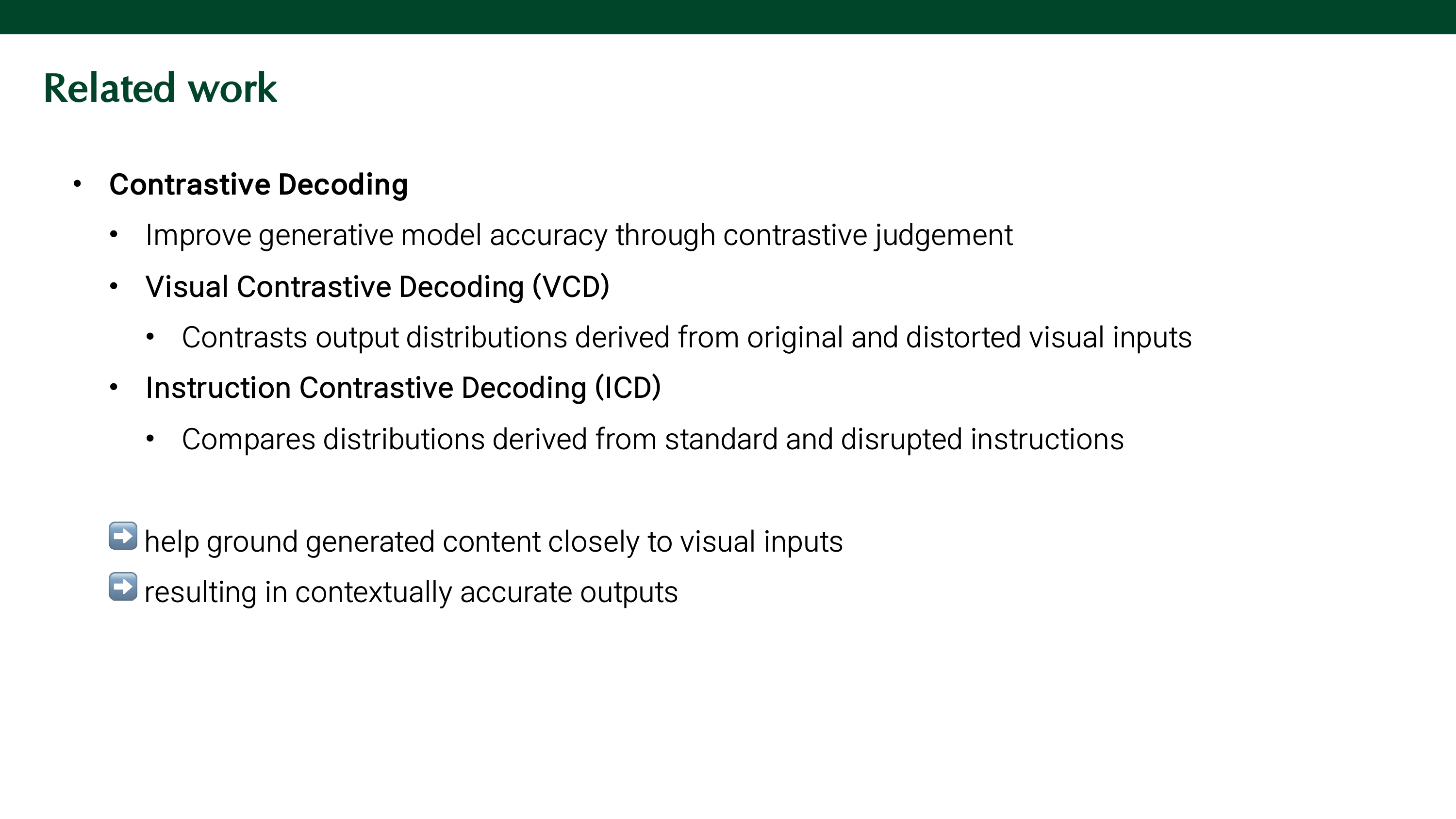 Instruction Contrastive Decoding (ICD)은 standard instruction과 disrupted instruction의 출력을 비교한다. 이러한 contrastive decoding은 추가 학습이나 모듈이 필요하지 않아 효율적이지만, 1) language priors를 억제하는 것이 출력의 품질을 저해시킬 수 있고, 2) contrastive input을 처리하는 것이 계산량을 늘려 inference speed를 늦춘다.
