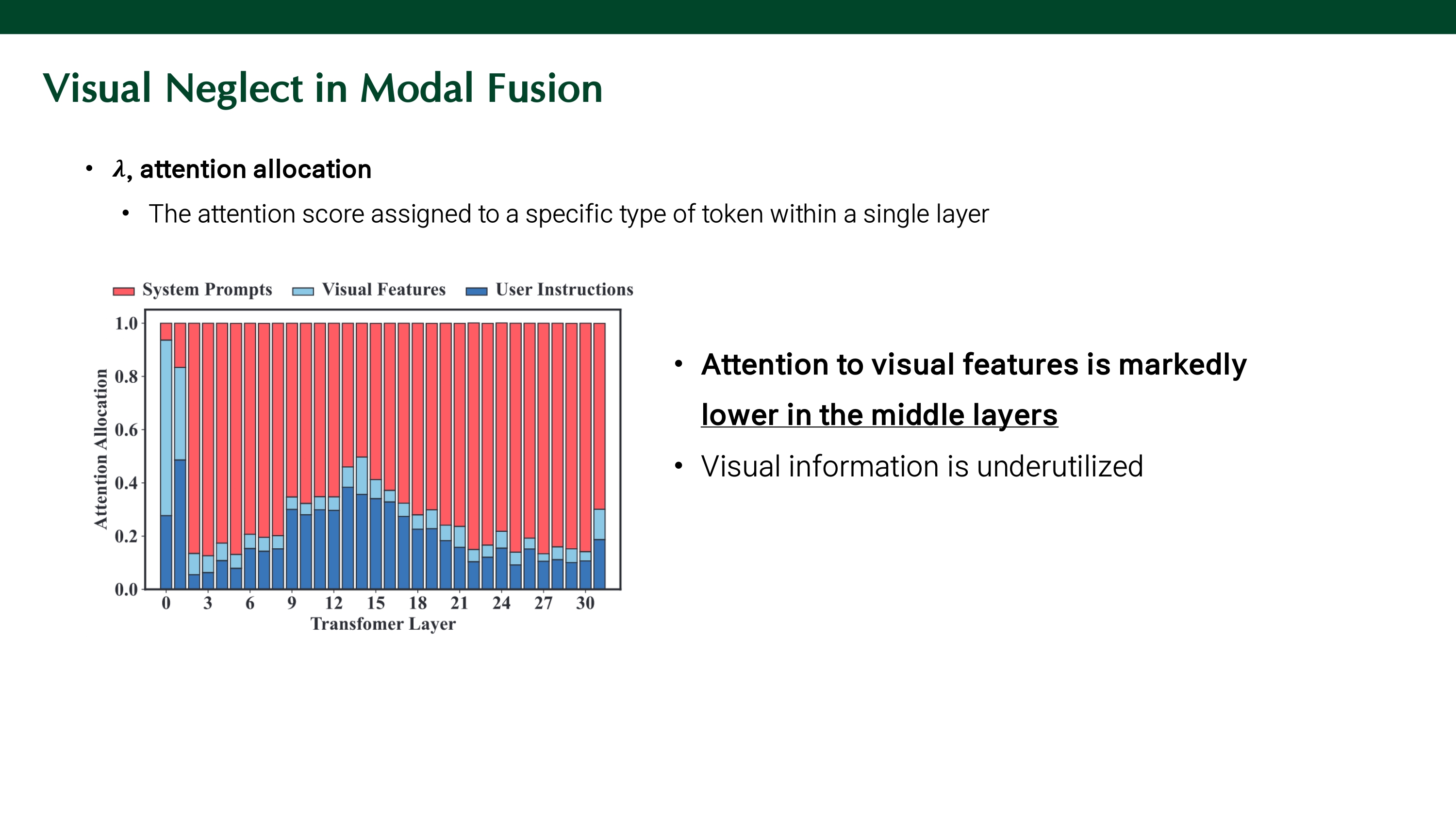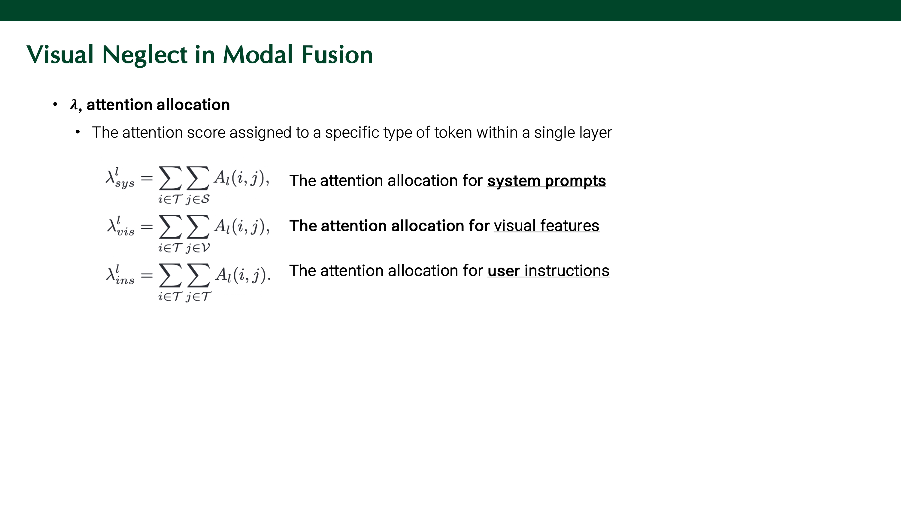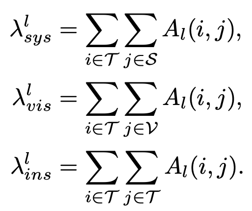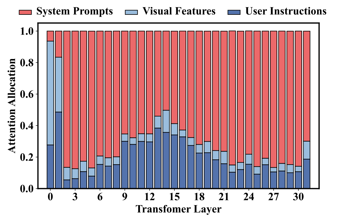 attention allocation, $\lambda$는 single layer에서 토큰에 할당된 attention score의 총량이다. 첫 수식은 instruction token이 system prompt를 얼마나 참고했는지, 즉, 시스템 프롬프트에 대한 attention 총량을 나타낸다. 두 번째 수식은 visual token에 대한 attention 총량을, 세 번째 수식은 instruction token에 대한 attention 총량을 의미한다.