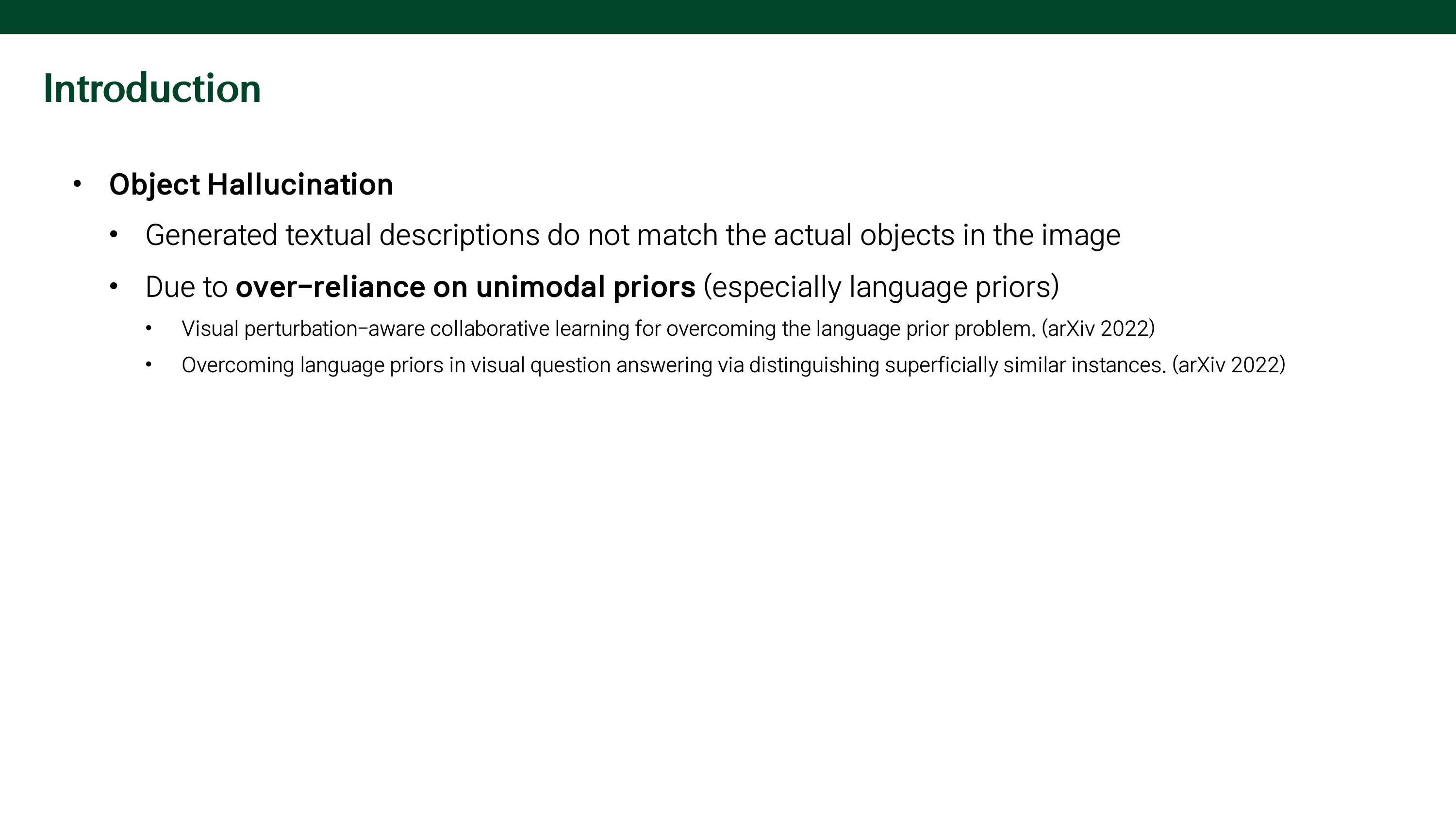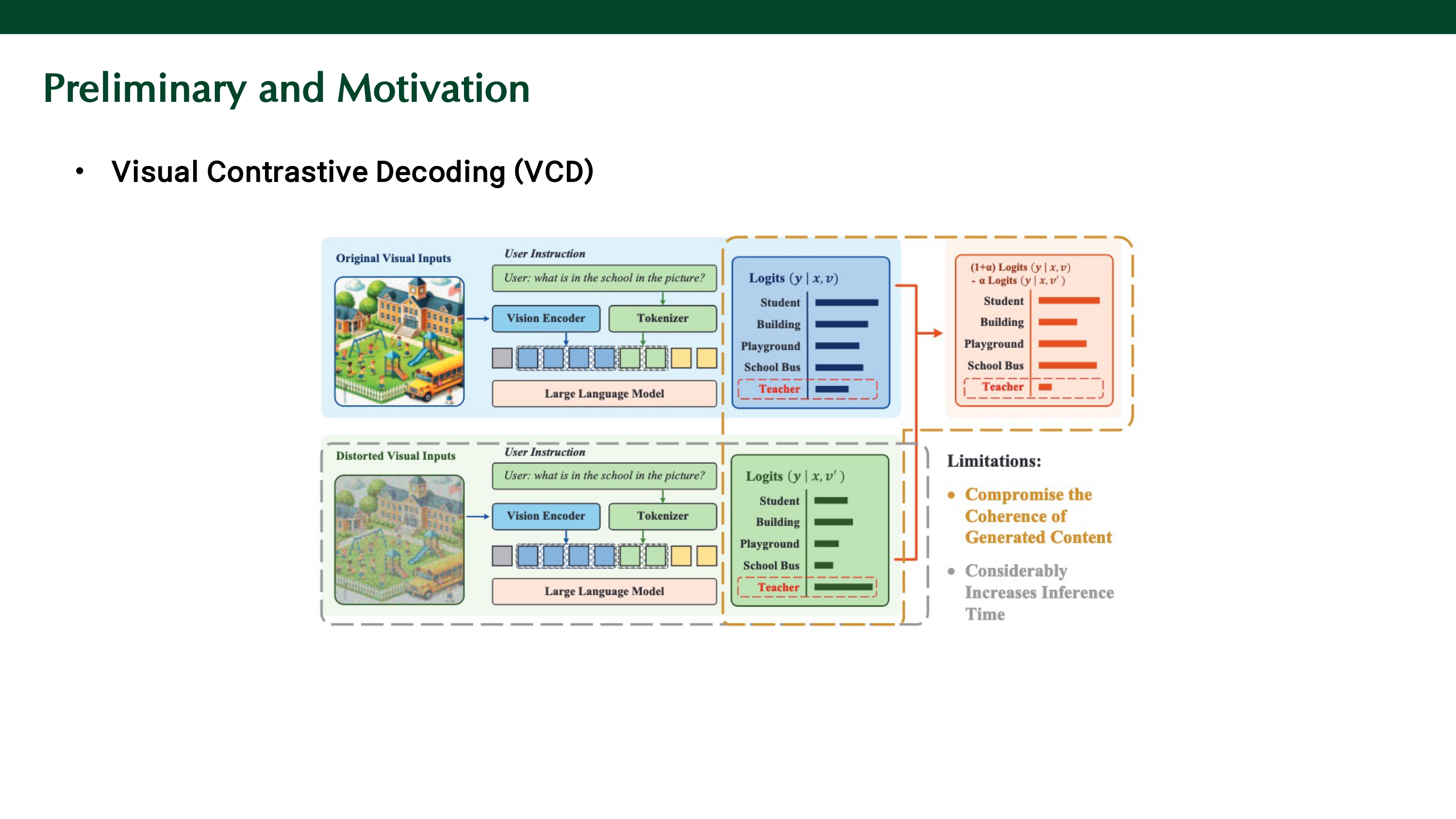 MLLM이 이미지 기반 질문에 답할 때, 모델이 language priors에 지나치게 의존하여 이미지에 없는 object에 대해 답변하는 object hallucination 문제가 존재한다. 이를 해결하기 위해 contrastive decoding을 사용할 수 있다. 이는 두 가지의 출력을 비교해서 language priors를 억제하는 방법이다.