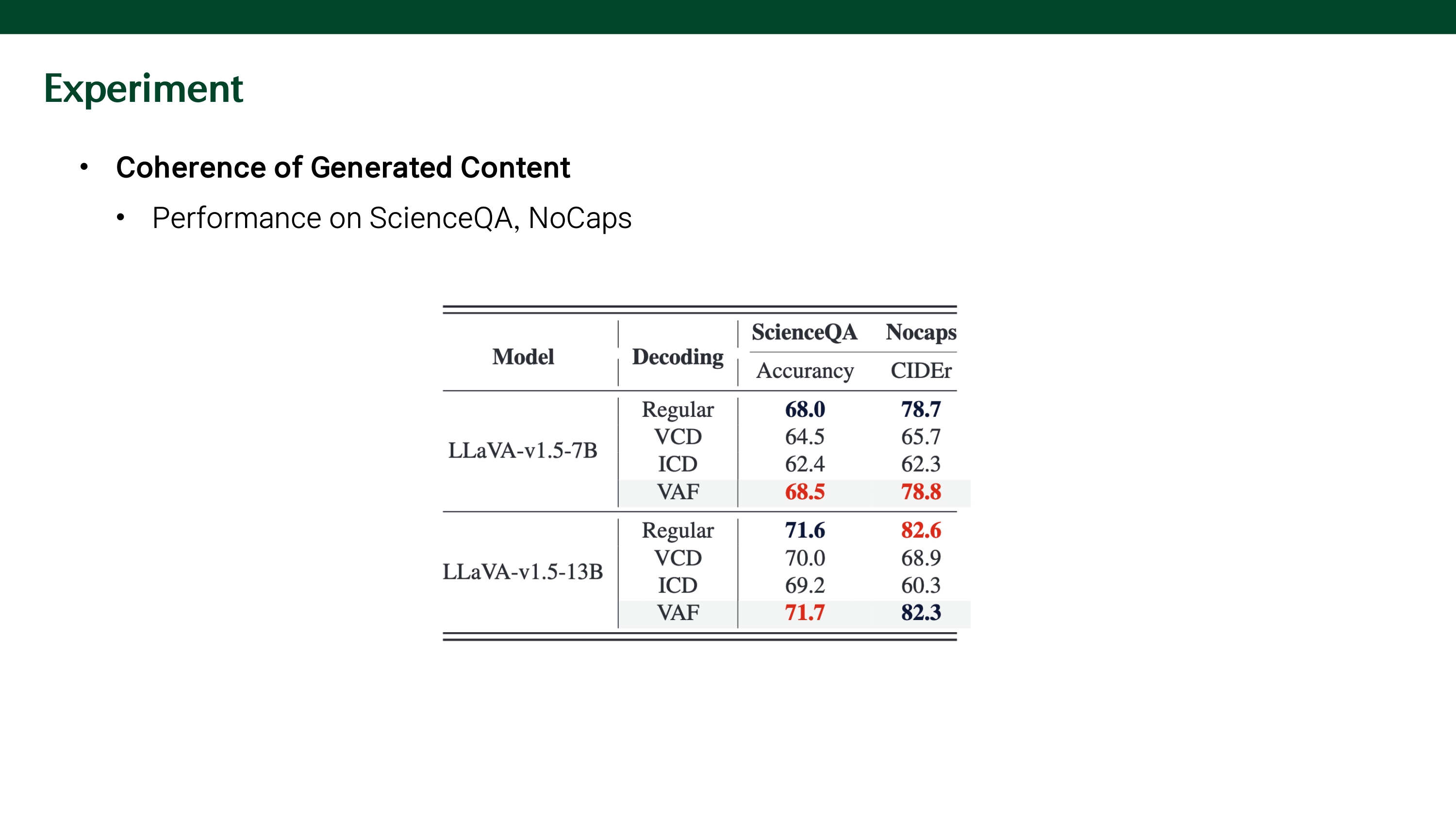 - VAF는 CIDEr score 유지해 coherence, accuracy를 유지함.