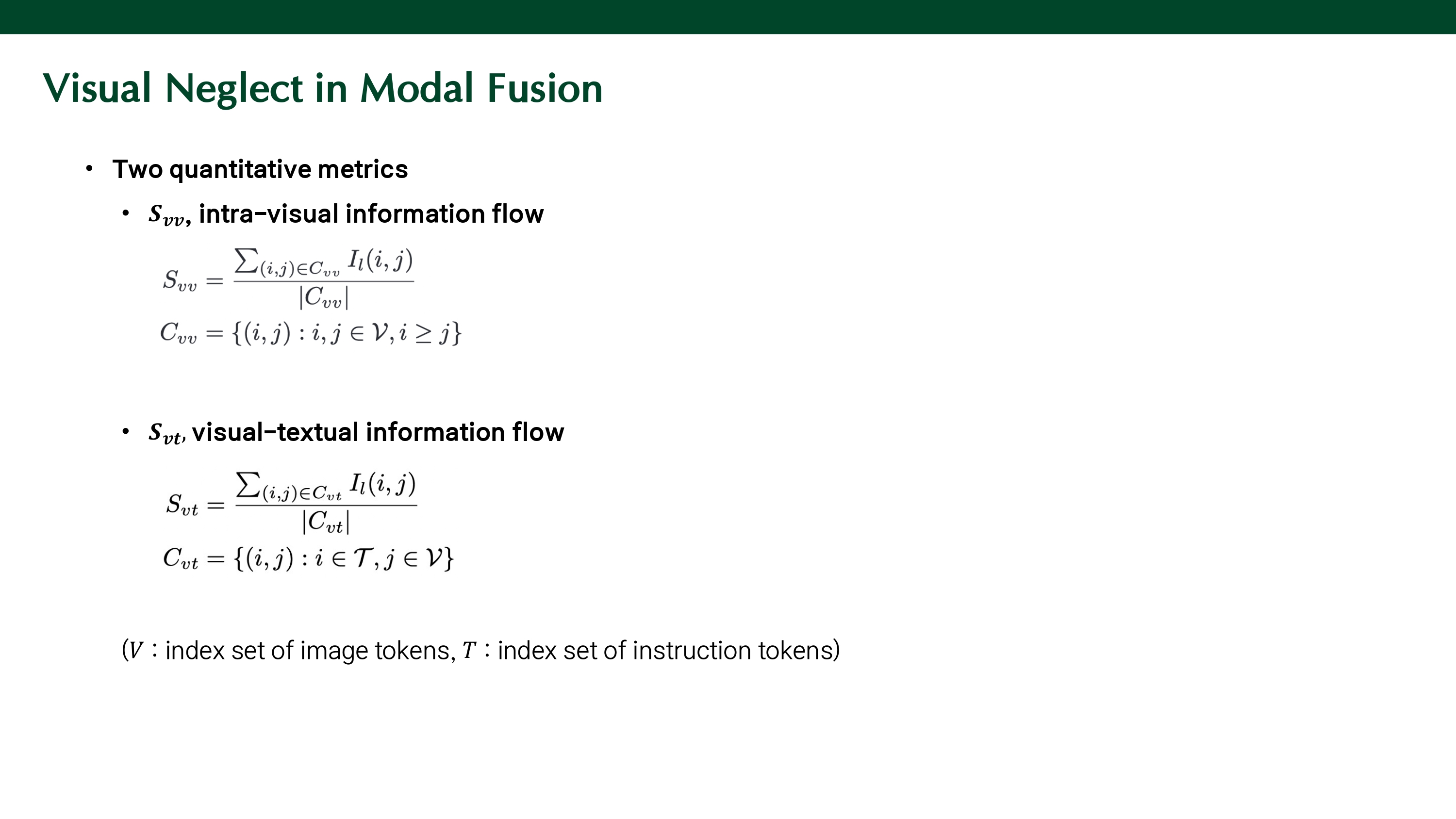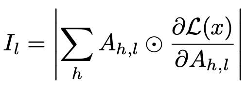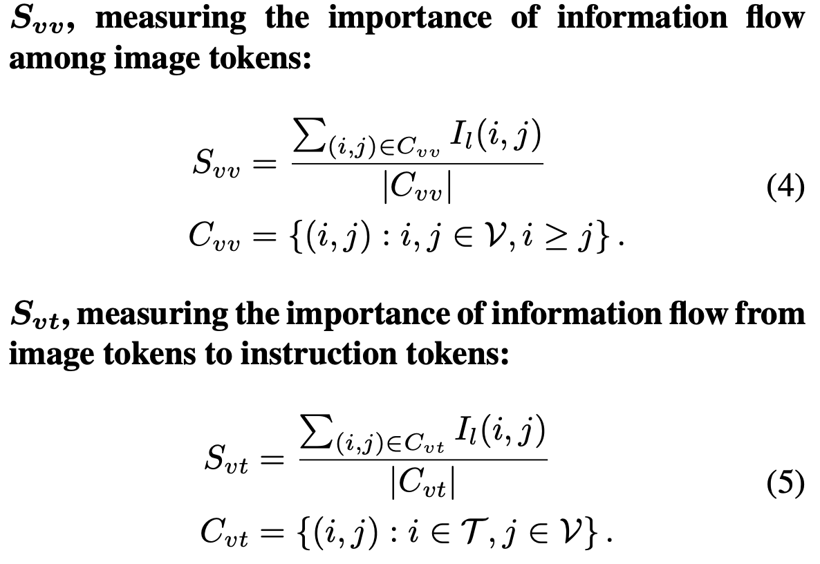 saliency score는 attention과 loss에 대한 gradient를 곱한 값을 통해 계산되며, $I_l(i,j)$는 layer l에서 토큰 j로부터 토큰 i로 흐르는 정보가 예측에 기여한 중요도를 나타낸다. Svv는 이미지 토큰끼리의 정보 흐름의 중요도를 측정하고, Svt는 이미지 토큰으로부터 instruction token으로의 정보 흐름 중요도를 측정하는 수식이다.