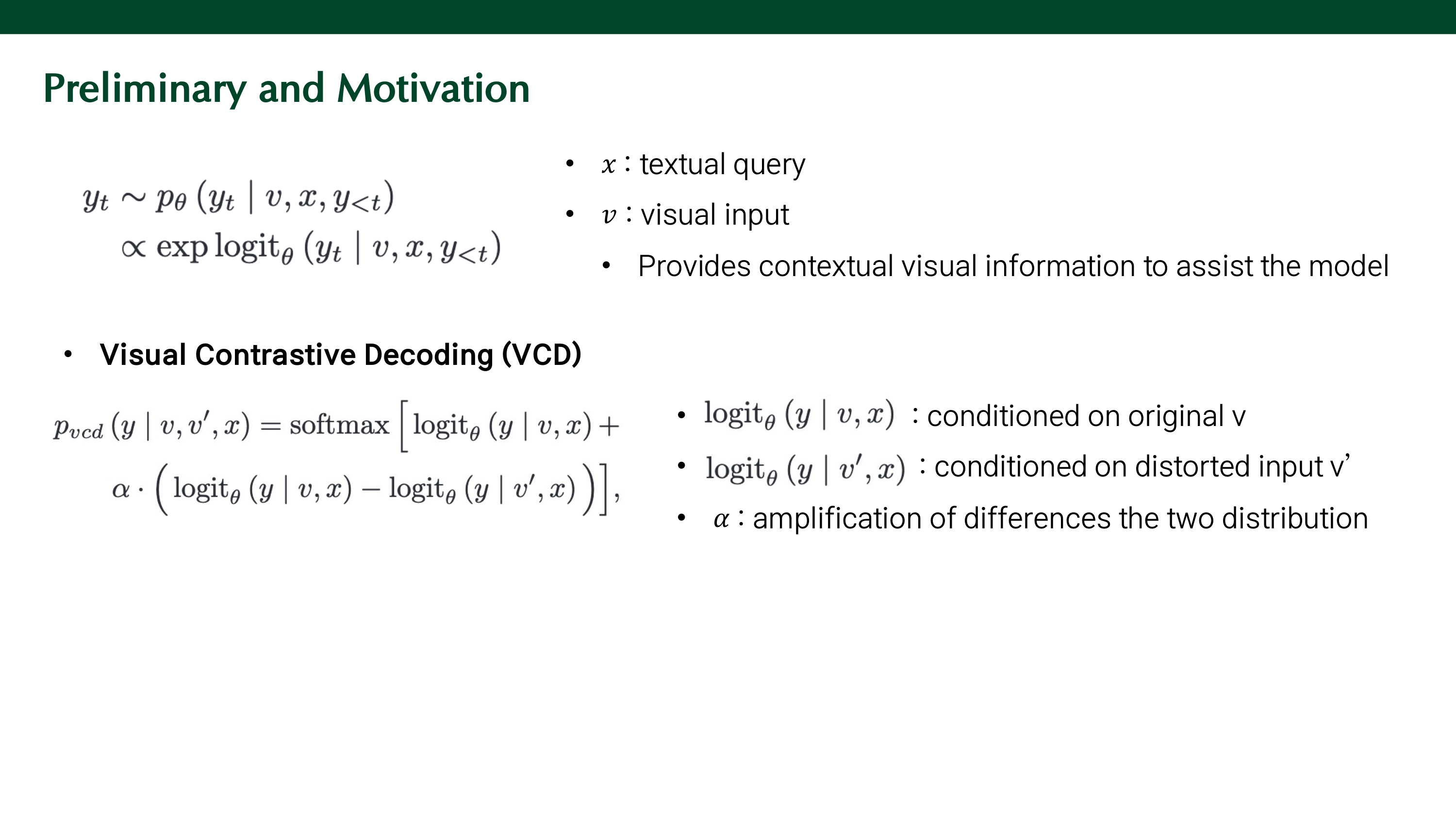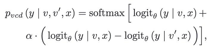 VCD 기법을 통해 새롭게 계산되는 distribution은 원본 이미지 v에 대한 logit에 해당 logit과 distorted visual input v'에 대한 logit의 차이에 scaling factor를 곱한 값을 더해주어 softmax를 적용한 것이다. visual 정보는 두 logit의 차이가 크기 때문에 강화되고, language 정보는 두 logit의 차이가 작아 상대적으로 억제된다.