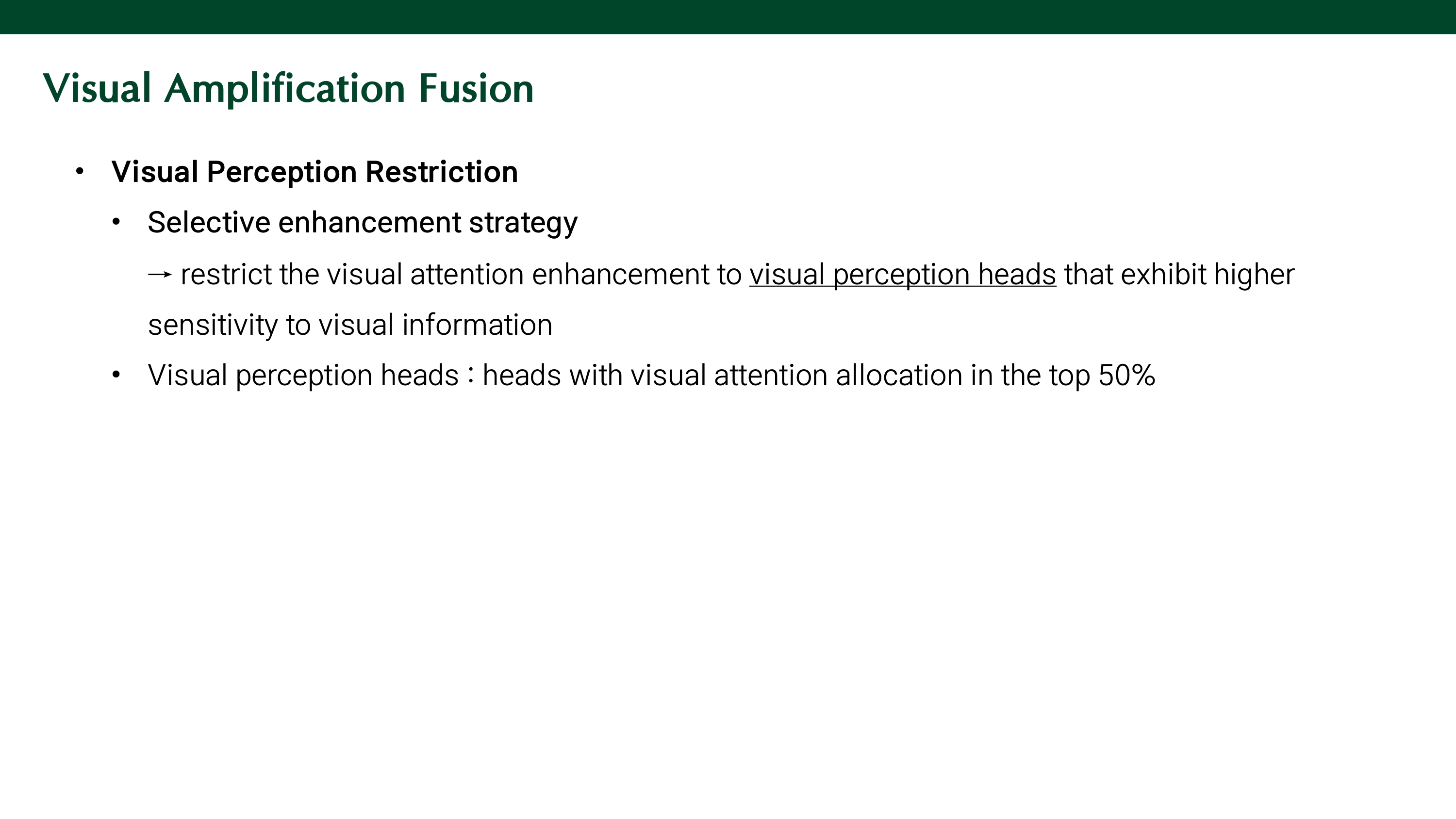 그러나, 모든 attention head에 대해 visual attention을 강화하면 content generation 성능에 영향을 끼칠 수 있다. 이를 해결하기 위해, selective enhancement strategy를 적용한다. visual information에 민감한 attention head를 visual perception head라고 할 때, 이 헤드에 대해서만 attention을 강화하는 것이다. $\lambda^{l,h}_{vis}$ 값을 기준으로 상위 50% head를 visual perception heads라고 정의한다.
