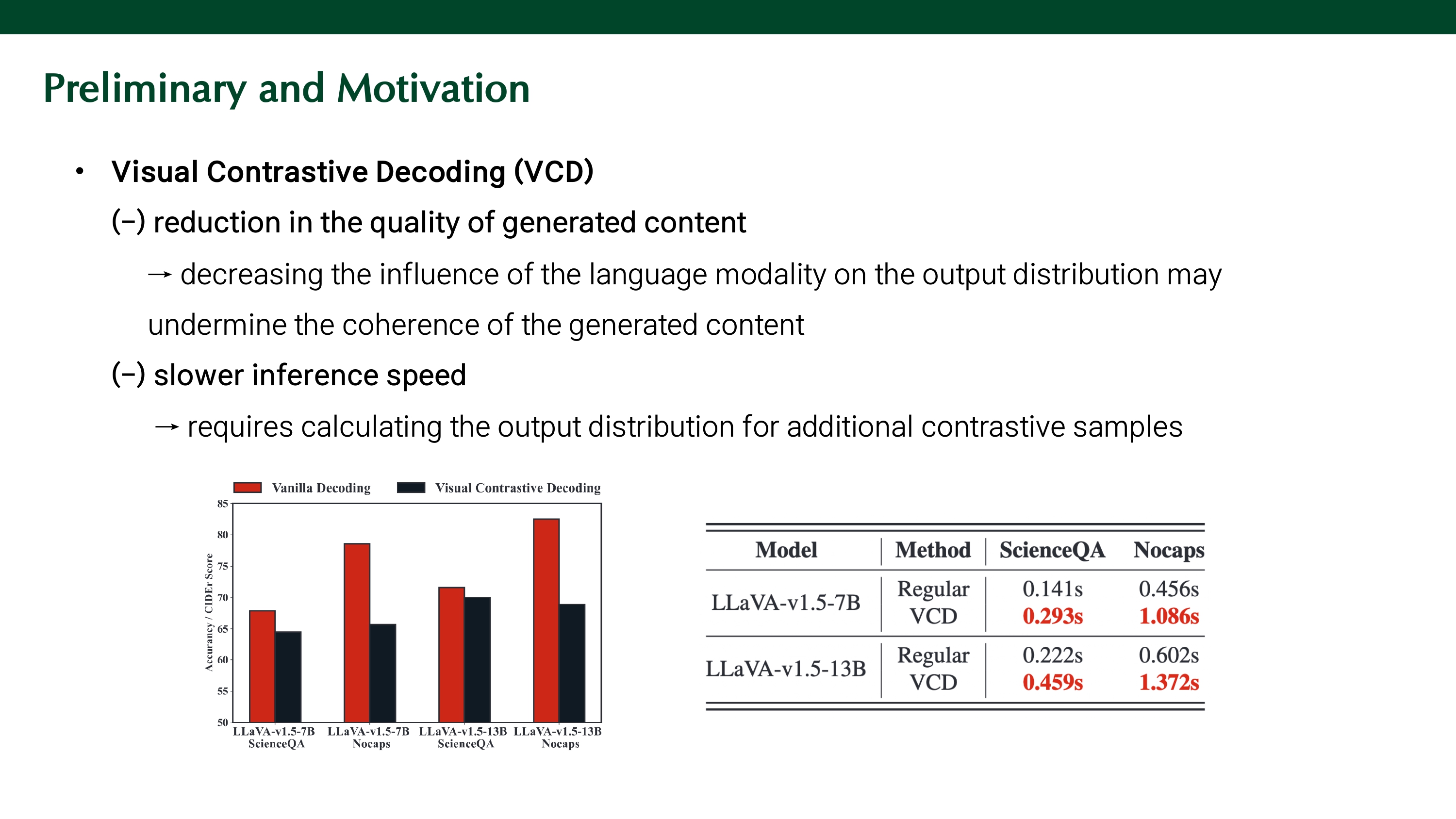 1) contrastive decoding은 예/아니오처럼 응답이 제한적인 태스크에서는 괜찮지만, 선택지가 많거나 captioning처럼 복잡한 태스크에 서는 출력의 품질 저하가 두드러진다. 실험 결과, ScienceQA 벤치마크에서는 5%, NoCaps 벤치마크에서는 45%의 성능 하락을 보여 contrastive decoding 사용이 language generation이 중요한 태스크에서 큰 성능 저하를 발생시킬 수 있음을 보였다.