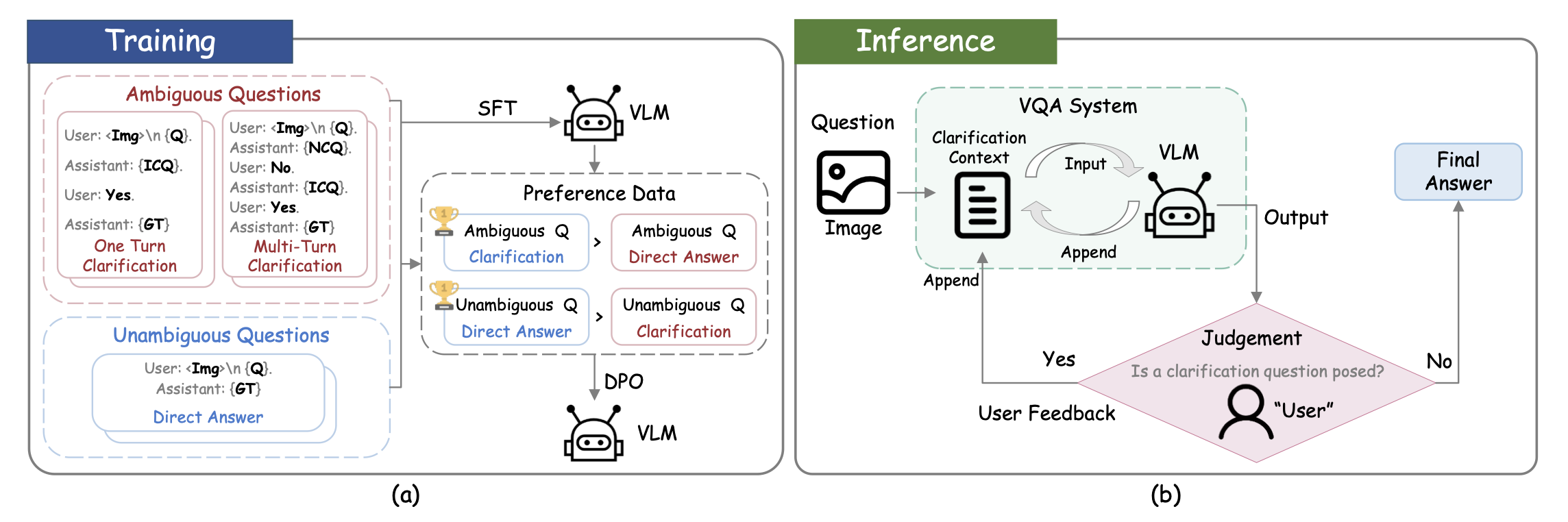 VLM이 SFT를 통해 interactive clarification을 할 수 있는 능력을 가졌다고 가정하고, DPO를 통해 명확한 질문은 불필요한 clarification을 하지 않으면서, 모호한 질문에는 clarification을 하도록 장려한다.