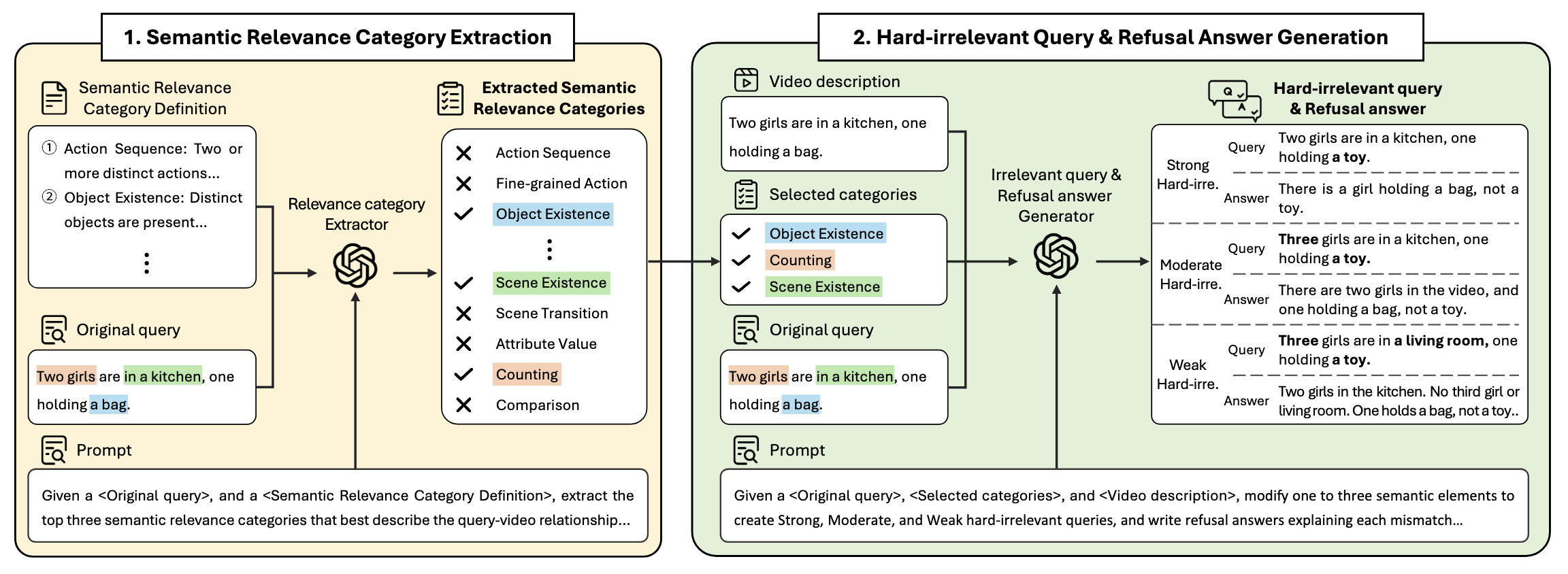 GPT-5-mini를 사용해 쿼리를 쿼리와 비디오 간의 관계를 잘 설명하는 11개의 semantic relevance category로 분류한다. 추출된 카테고리와 기존 쿼리를 기반으로, 하나에서 세 개의 semantic element를 변형한다. 한 가지를 변형하면 Strong Hard-Irrelevant, 두 가지를 변형하면 Moderate Hard-Irrelevant, 세 가지를 전부 변형하면 Weak Hard-Irrelevant로 분류된다. 생성된 각 쿼리에 대해 GPT-5-mini를 사용해 쿼리가 영상과 일치하지 않는 이유를 설명하는 refusal answer을 생성한다.