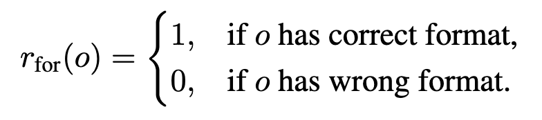 - Format Reward: 모델이 미리 정의된 템플릿에 맞추어 출력을 생성하도록 함